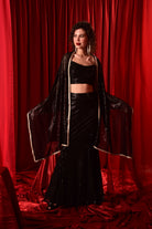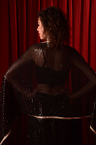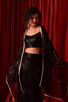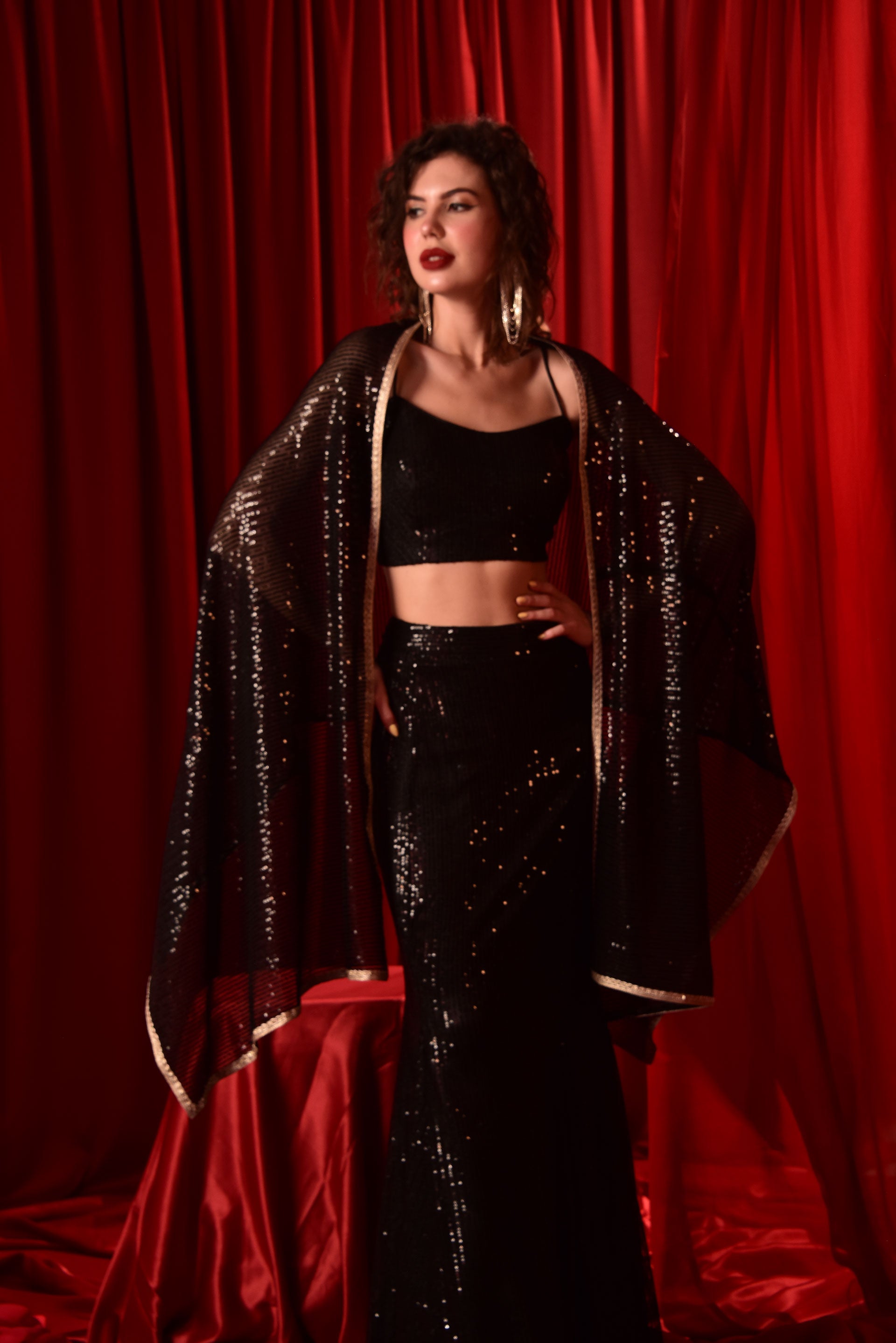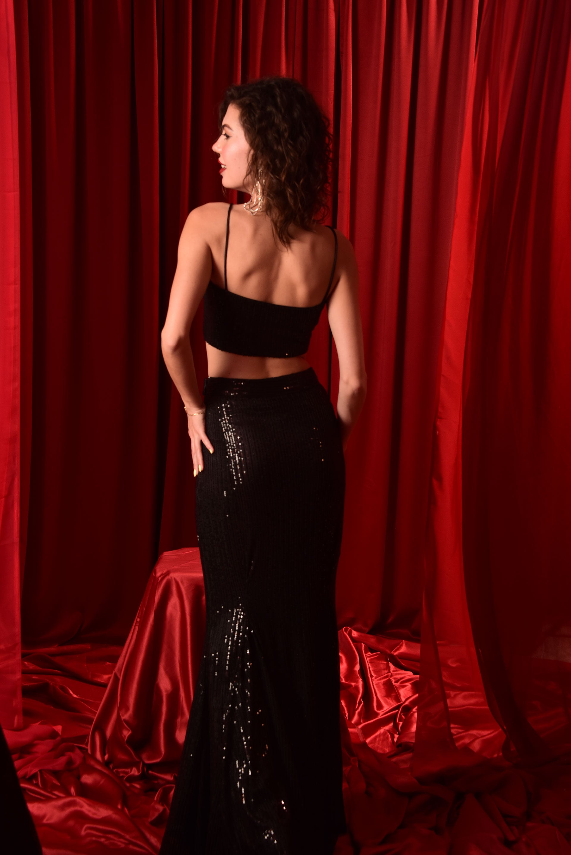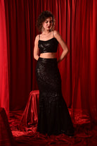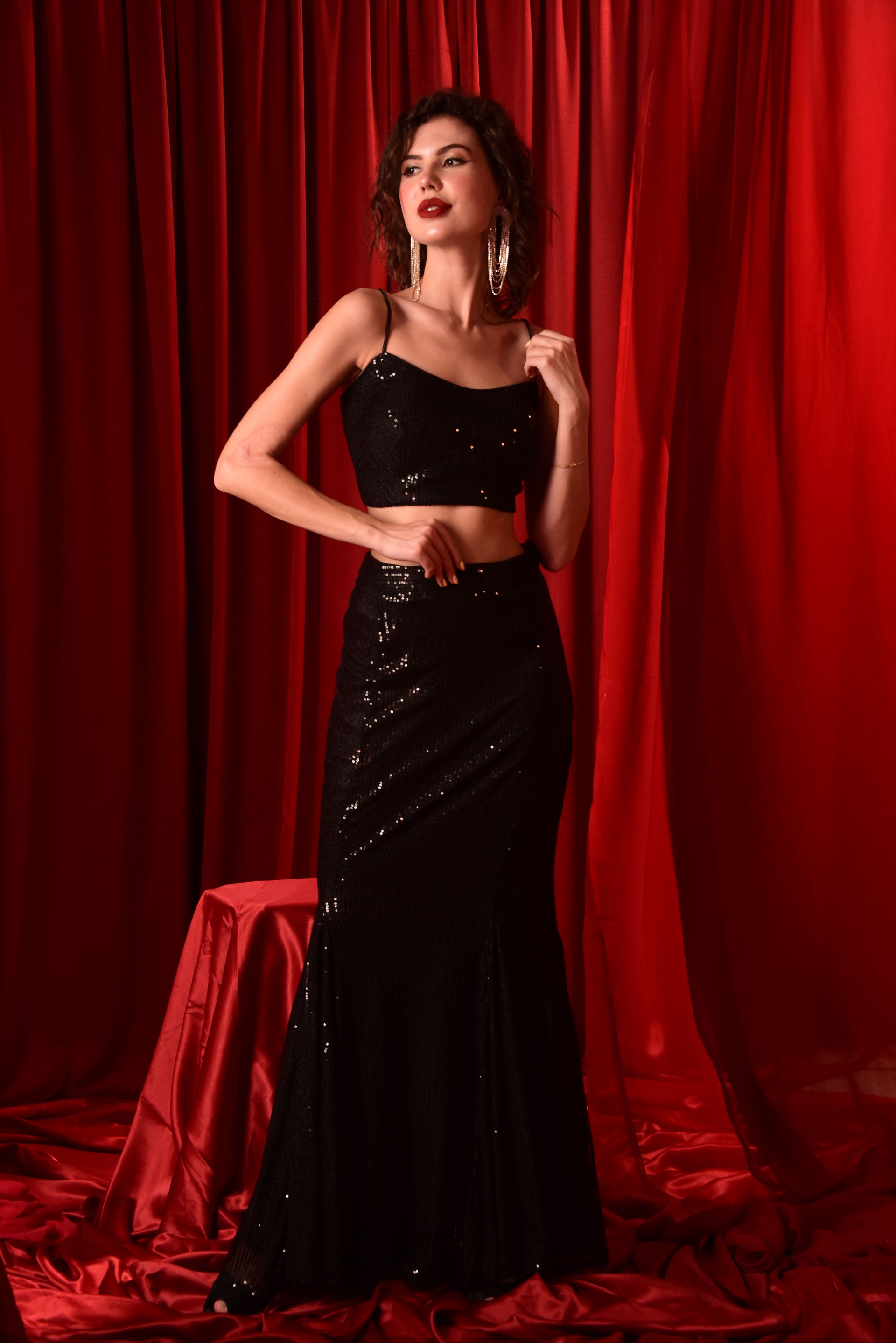 BLACK SEQUINCE BLOUSE WITH FISH CUT SKIRT AND SHURG
