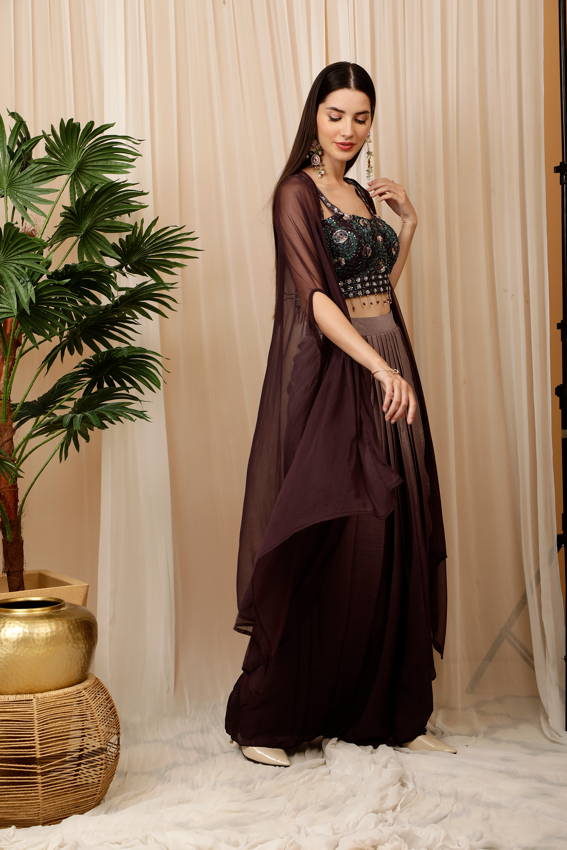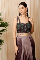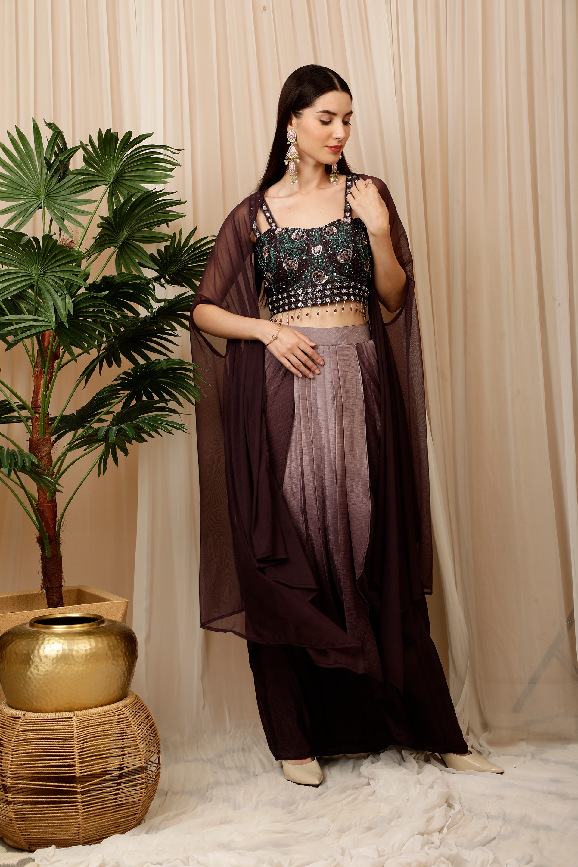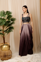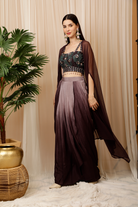 Twirl into style with our ombre purple dhoti skirt and matching crop top and shrug. Easy to mix and match for versatile looks. Perfect for adding an unconventional touch to your wardrobe. Get ready to stand out!