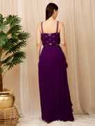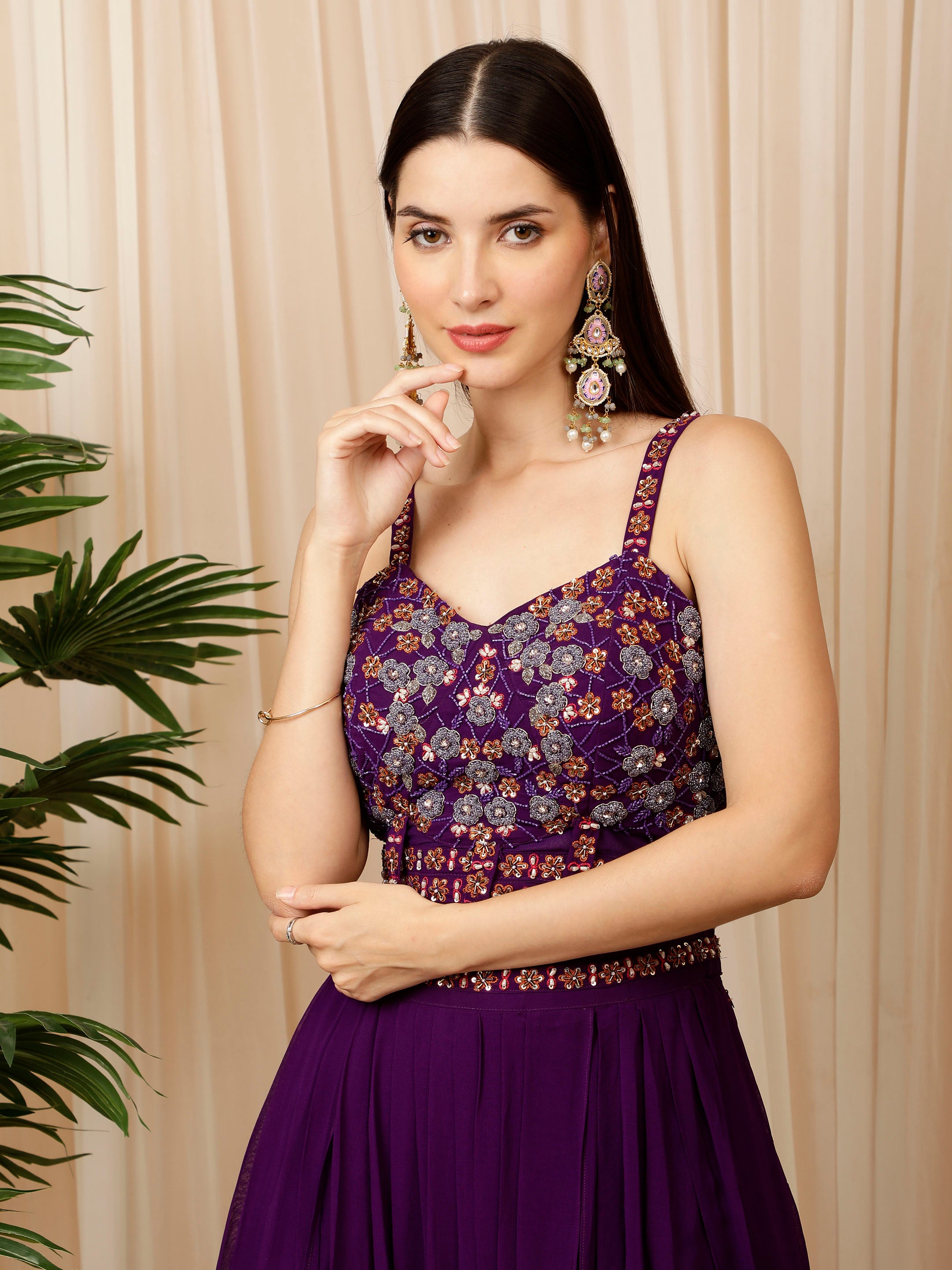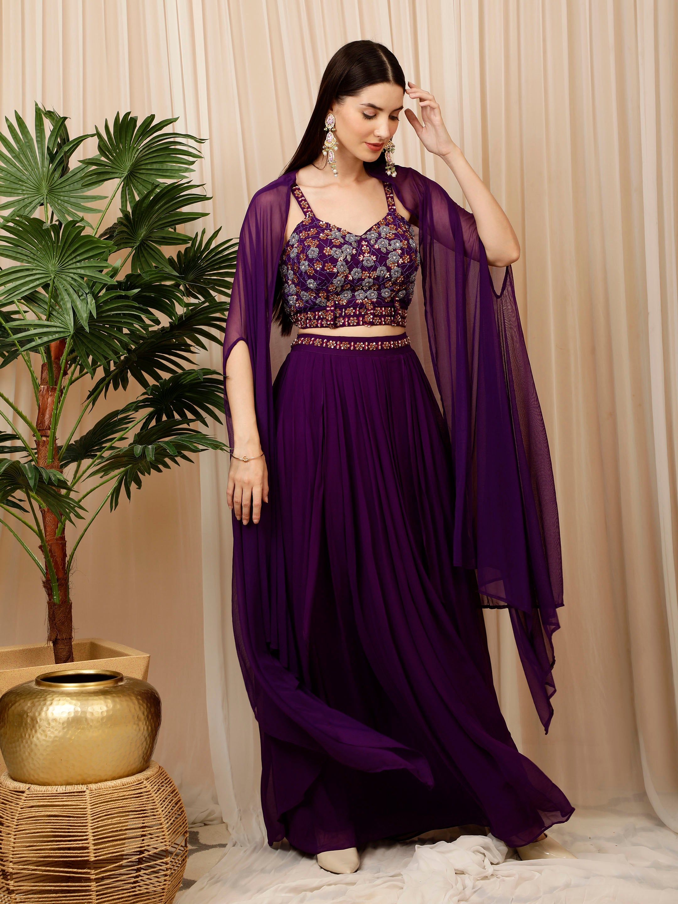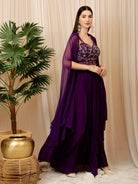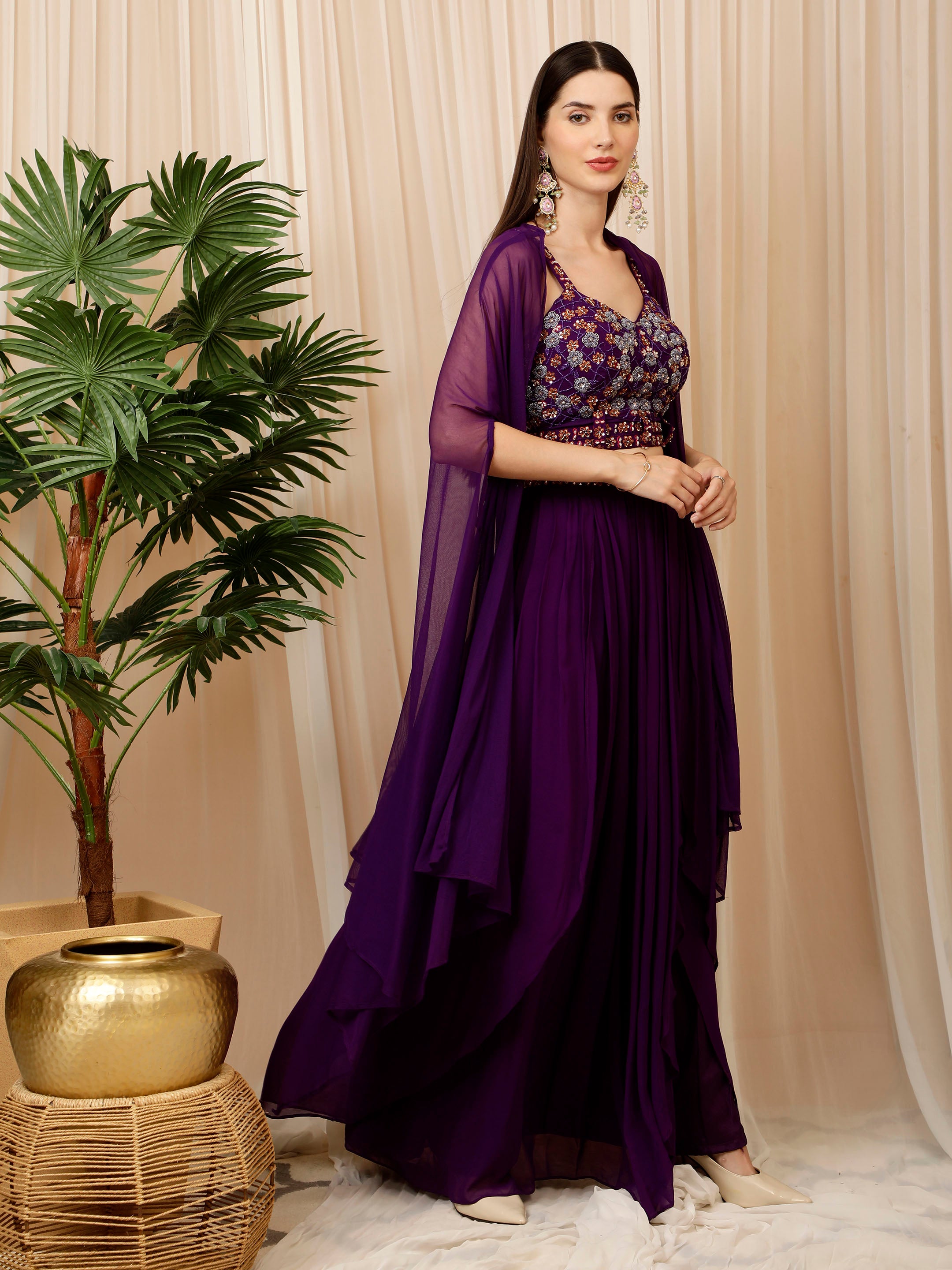 Voilet colored indowestern dress in soothing flary fabric with a beautiful cape