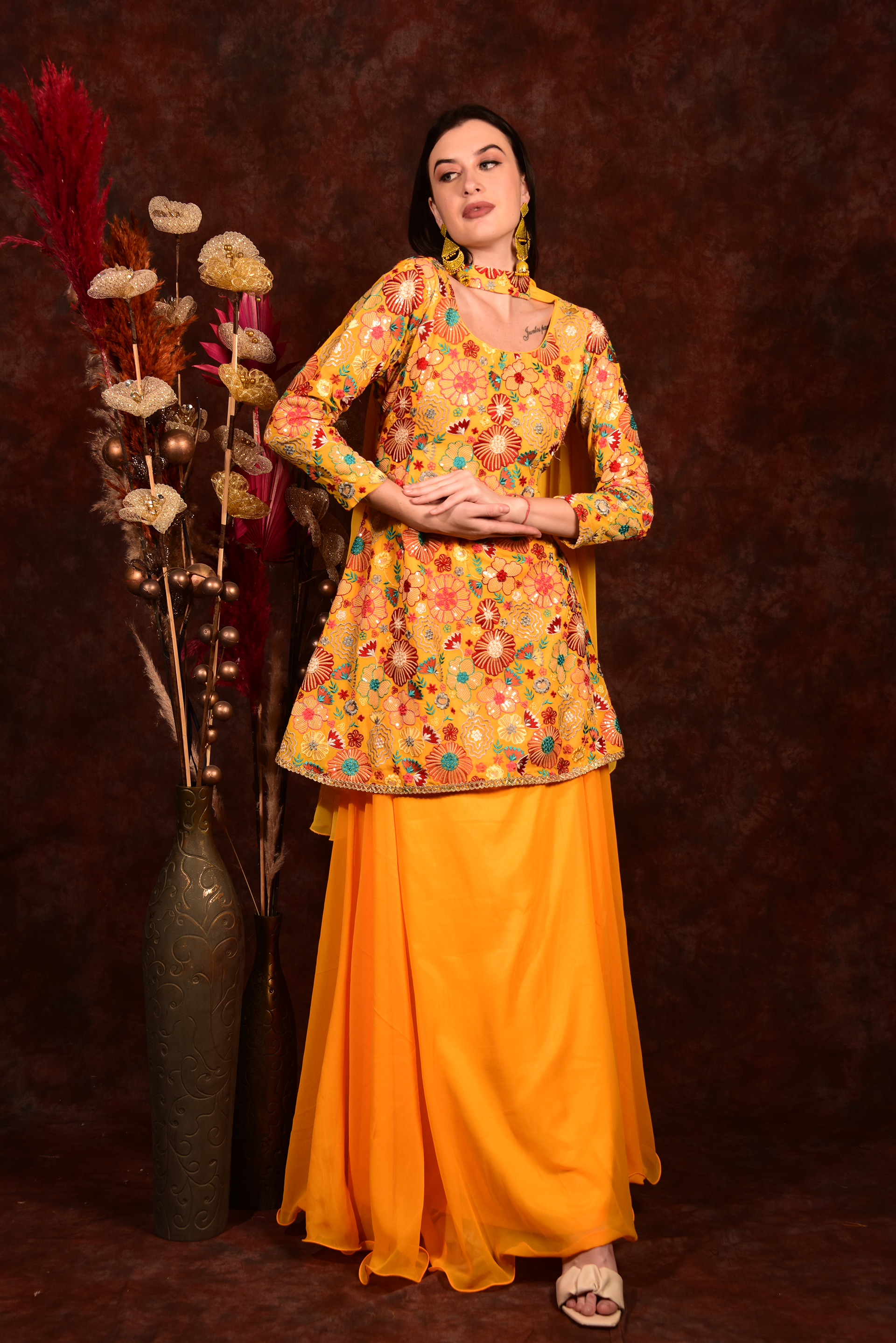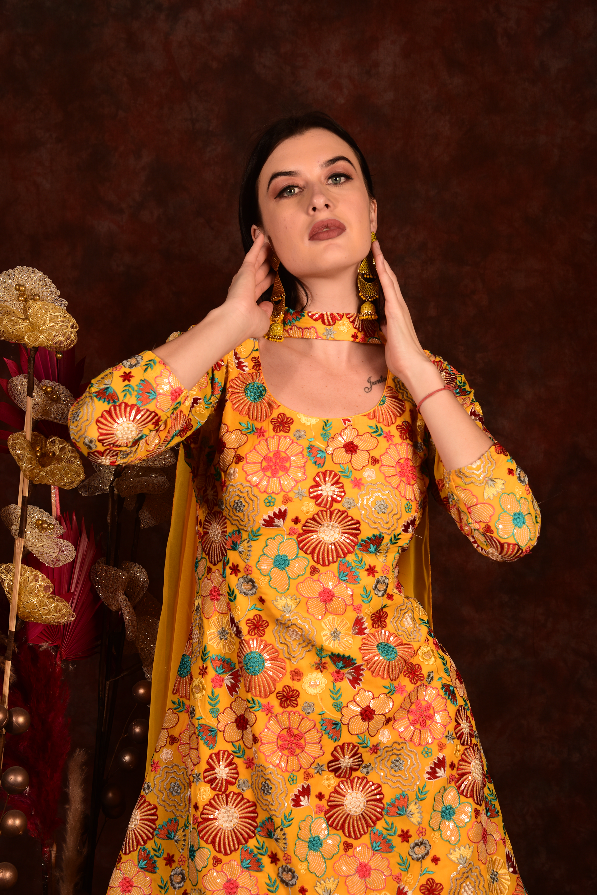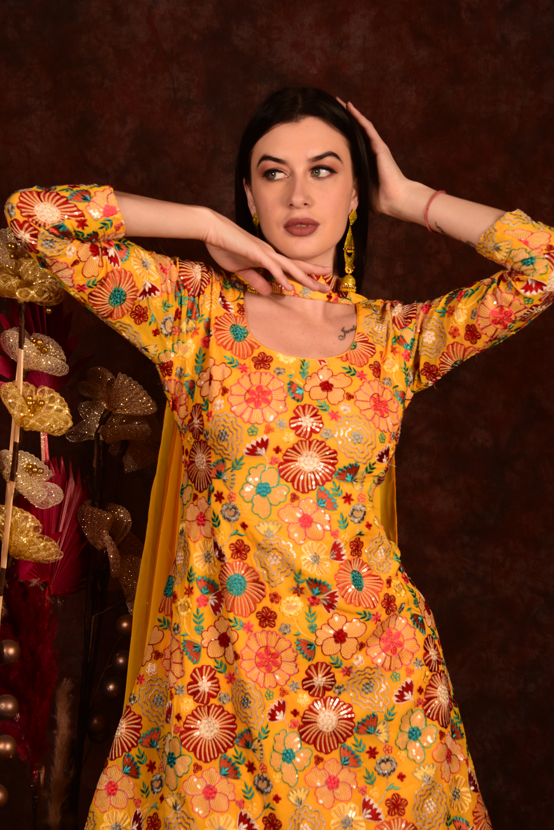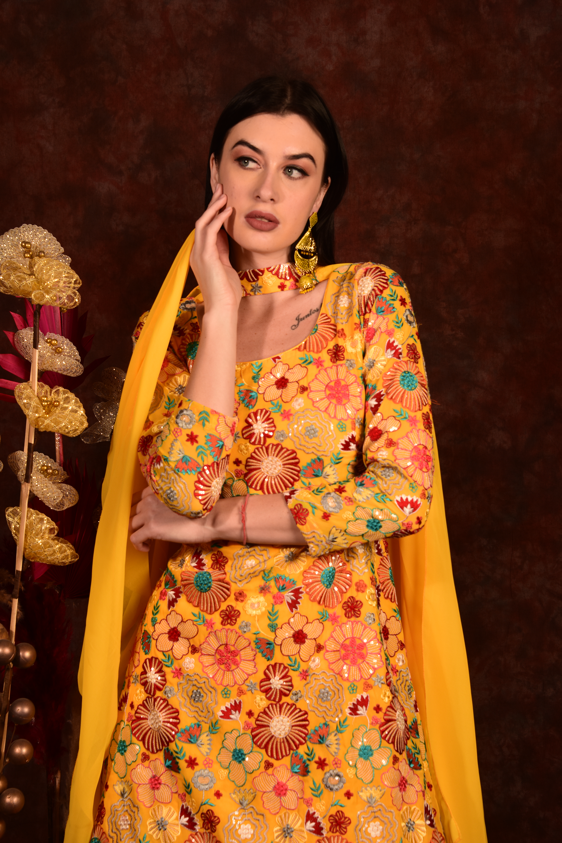 Rock the summertime in this bright and blooming yellow floral set. The peplum top adds a fun twist to the traditional silhouette, while the coordinating skirt and dupatta complete the look with a pop of playful style. Perfect for sunny days and picnics with friends!