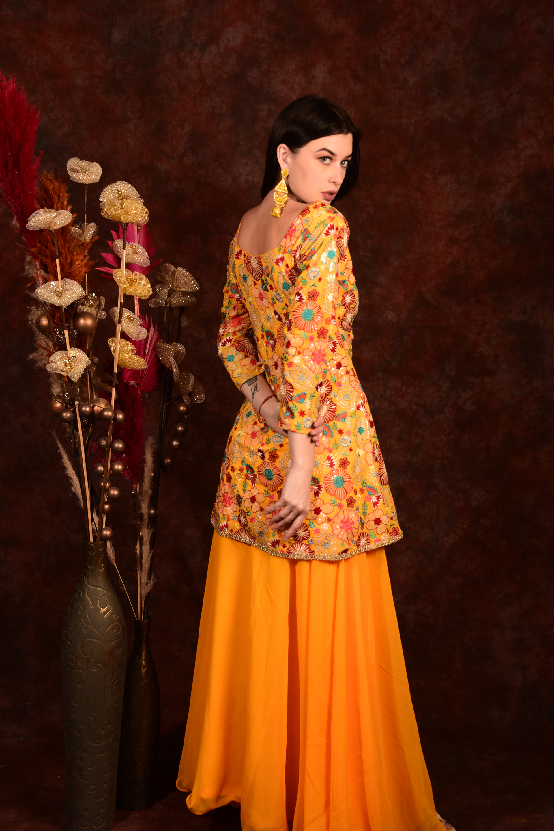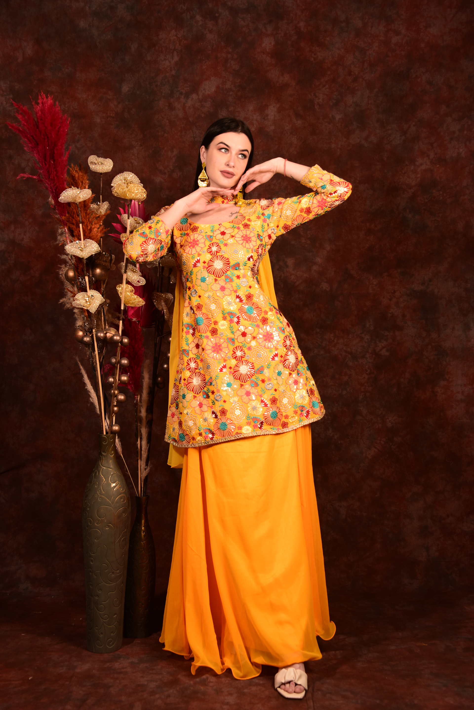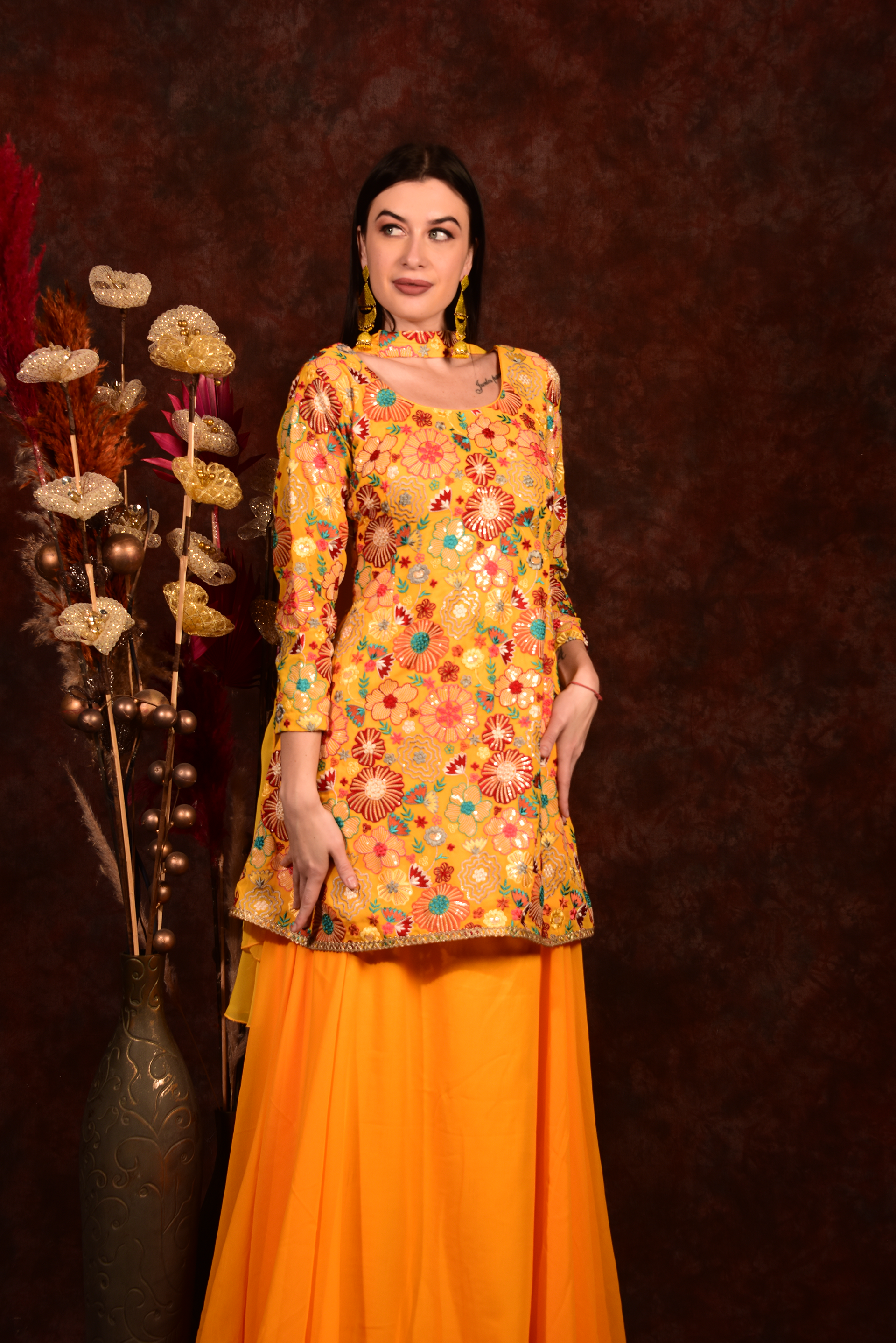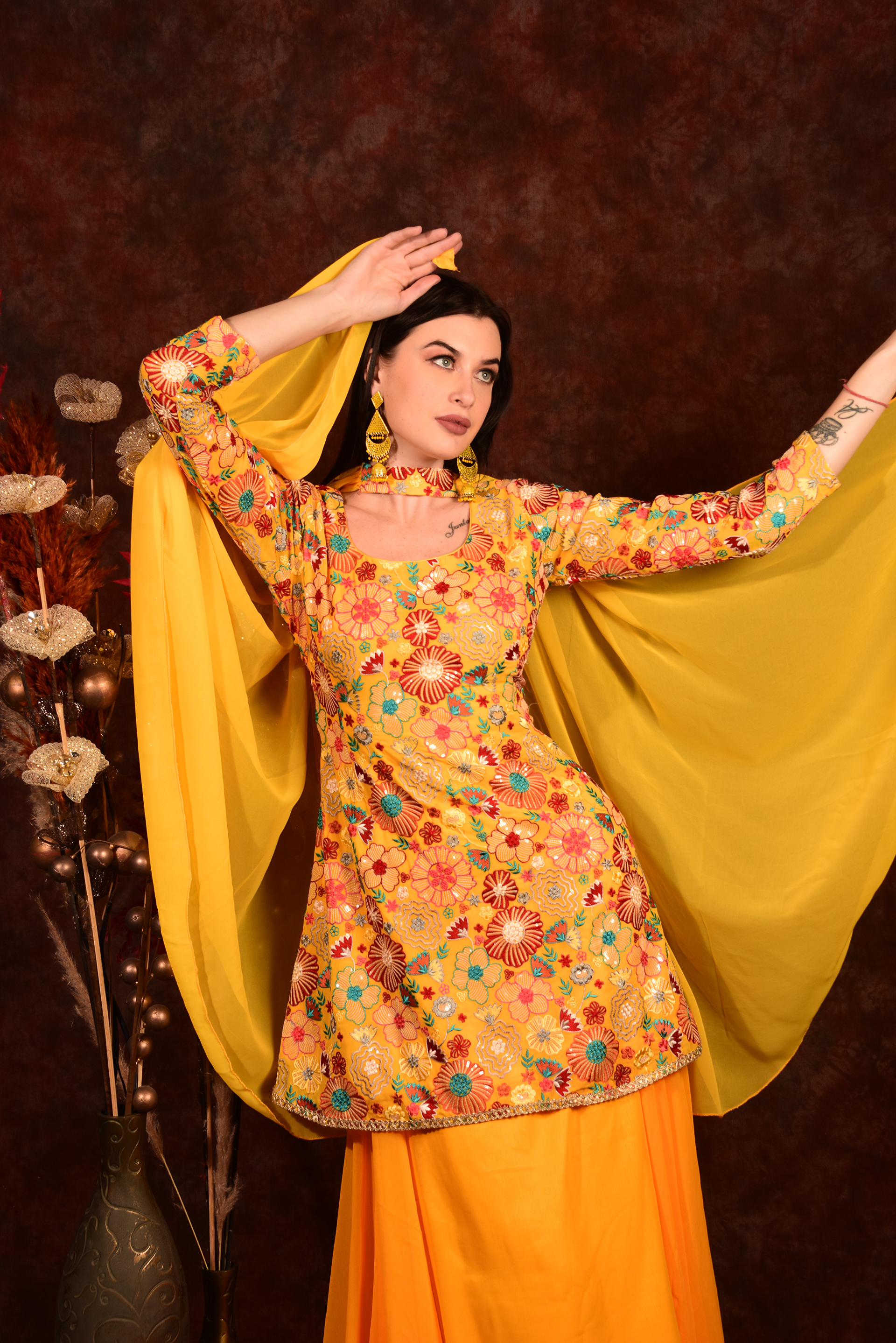 Rock the summertime in this bright and blooming yellow floral set. The peplum top adds a fun twist to the traditional silhouette, while the coordinating skirt and dupatta complete the look with a pop of playful style. Perfect for sunny days and picnics with friends!