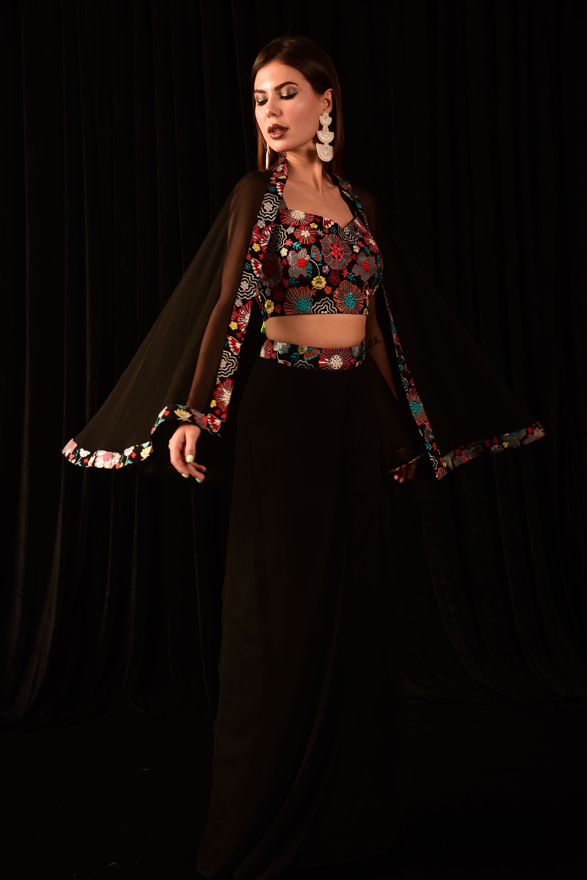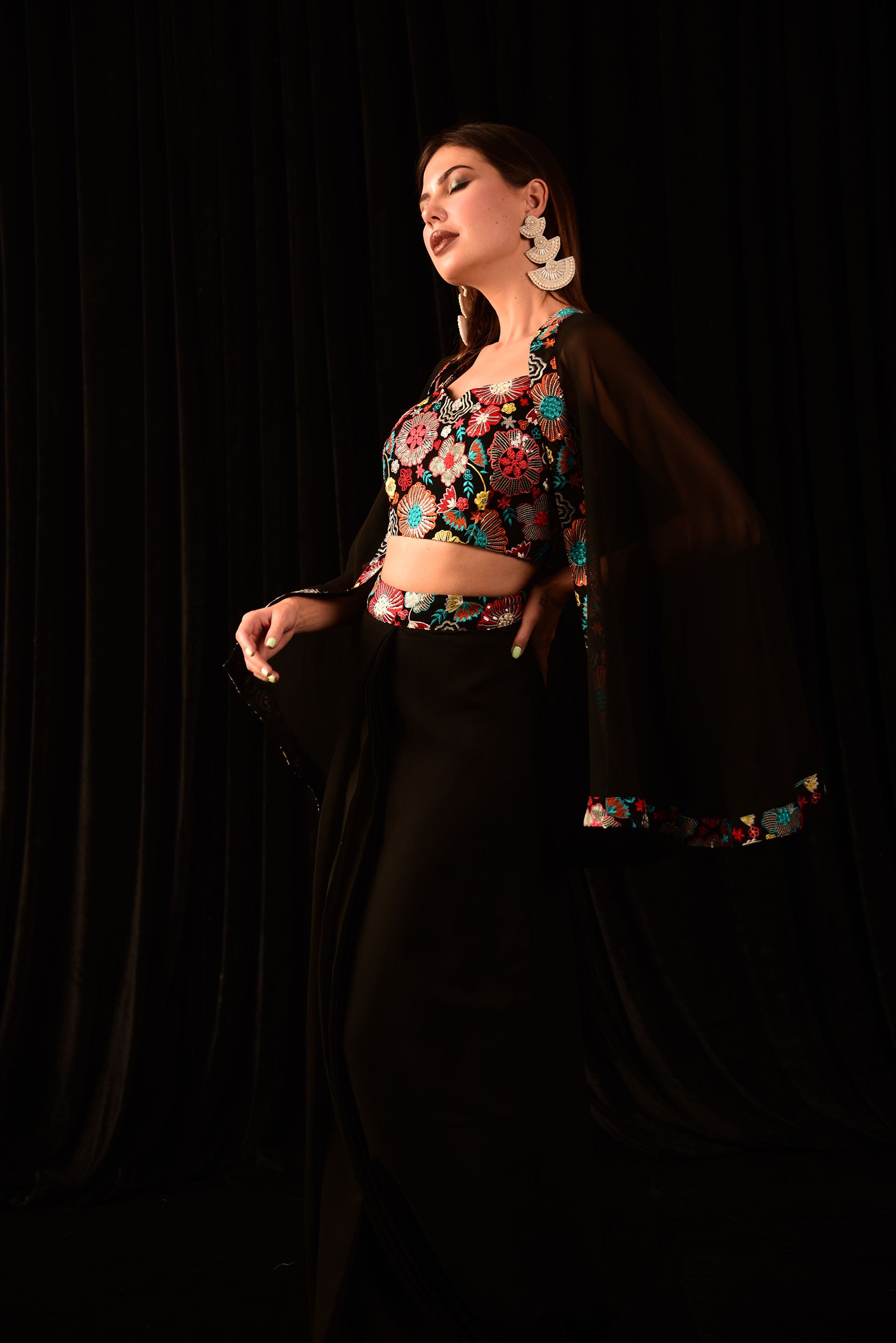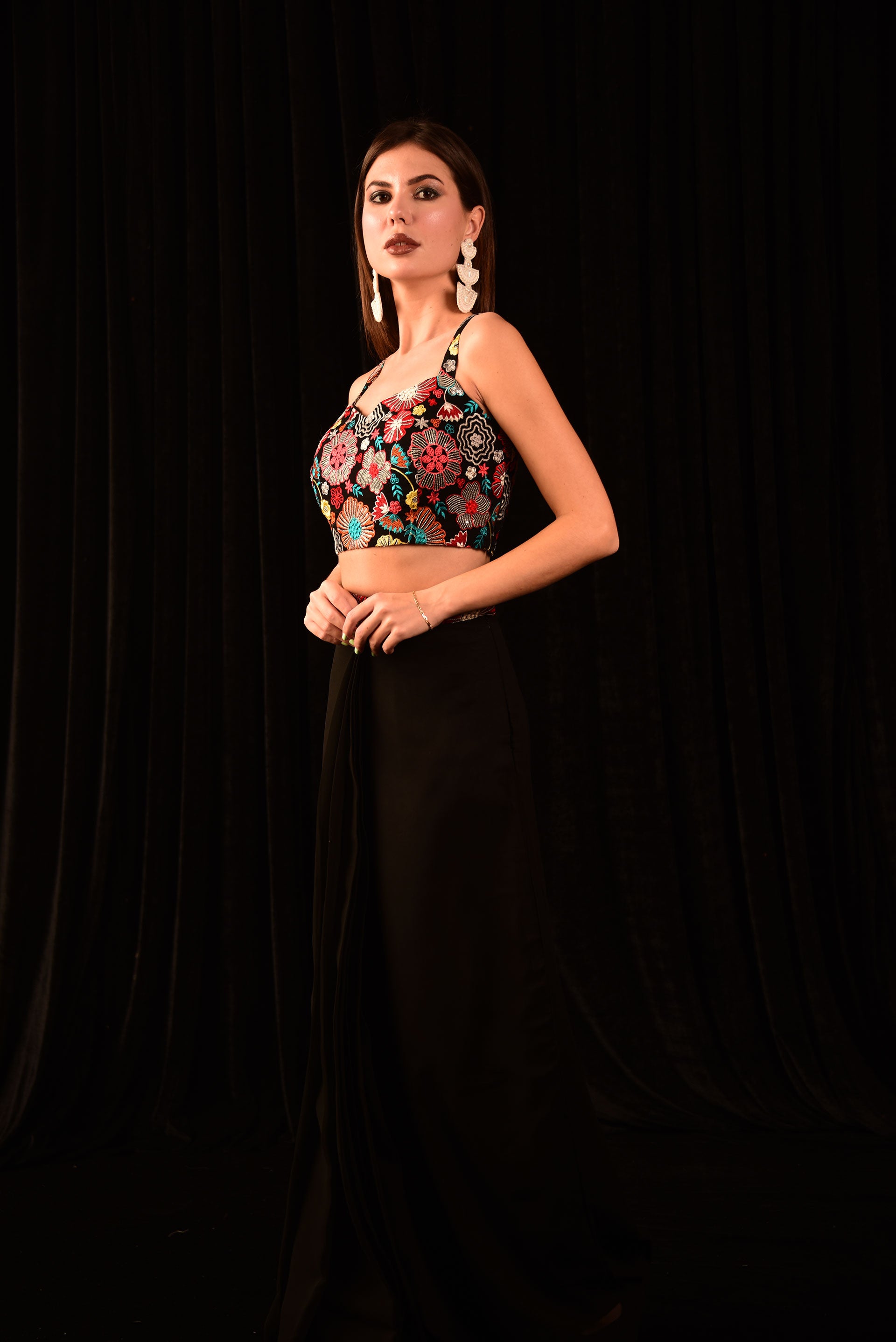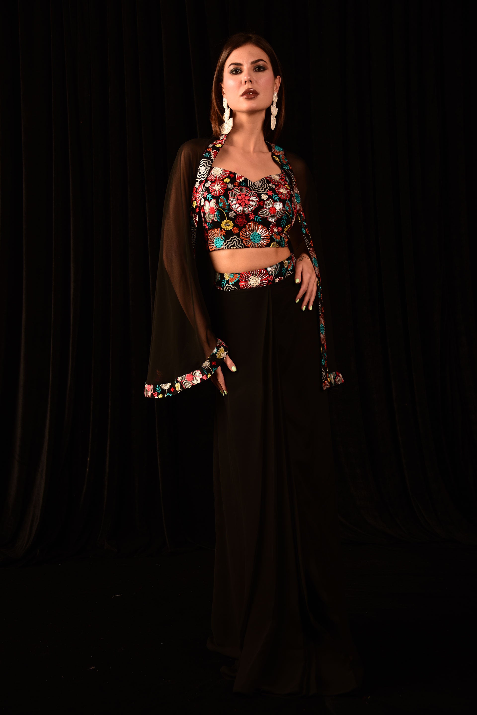 BLACK CROP TOP FLORAL SKIRT SHRUG