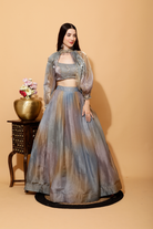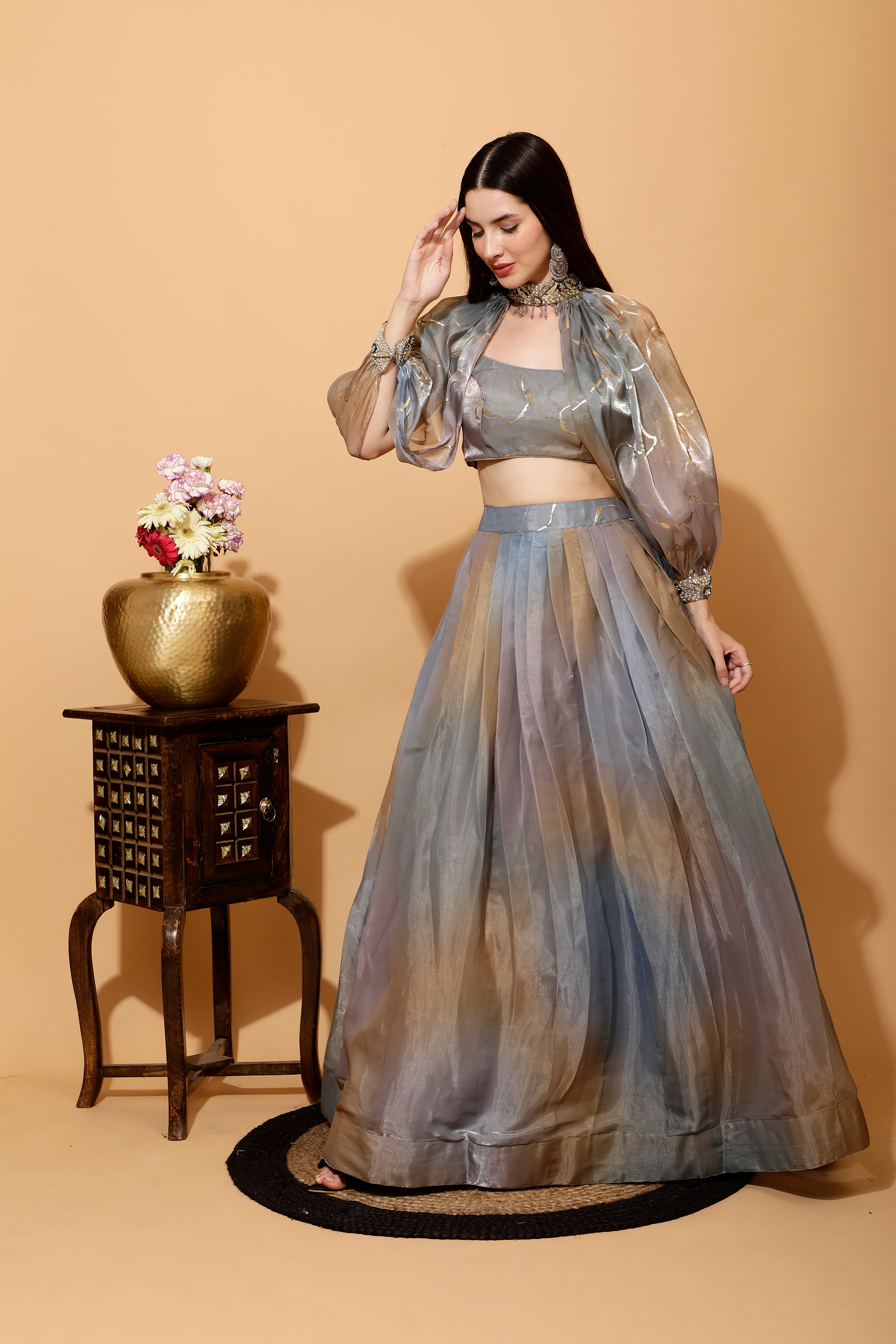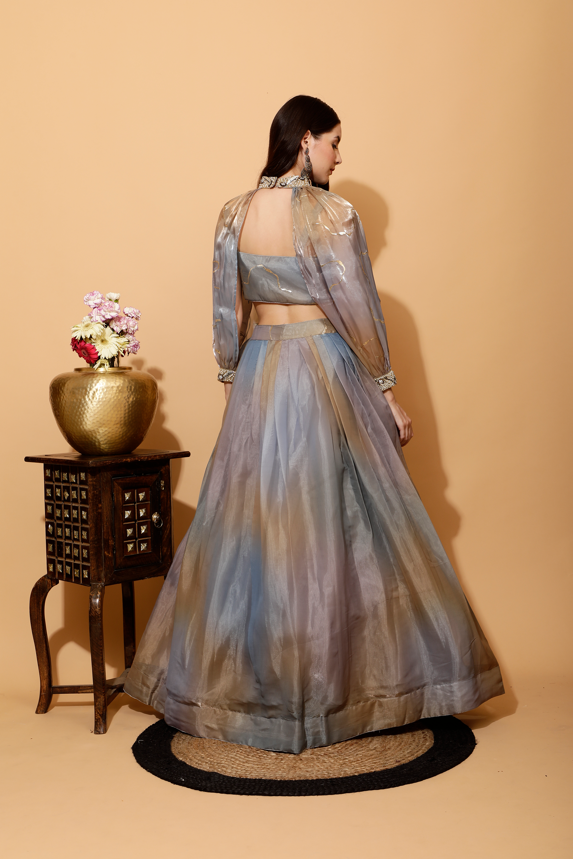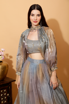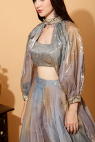 Grey Designer Blouse With Tissue Silk Skirt And Choker Sleeves