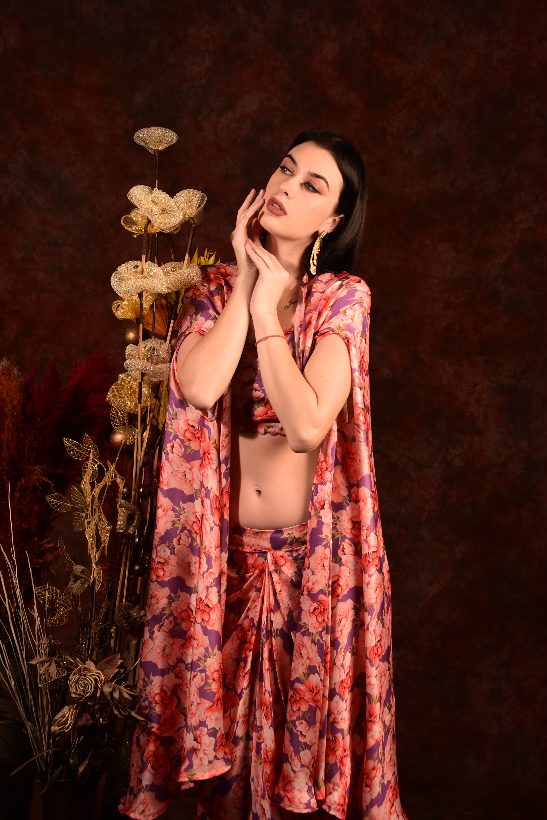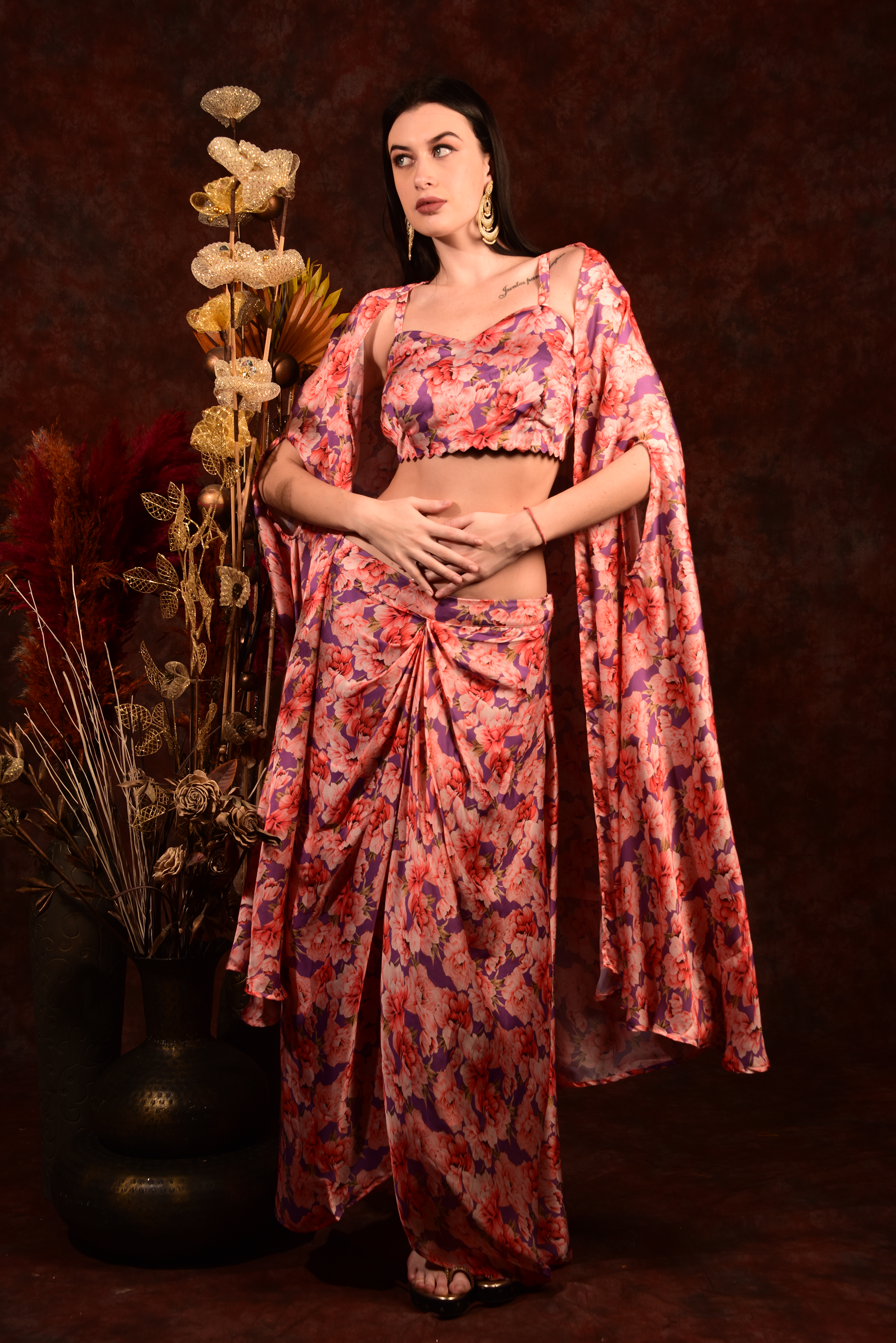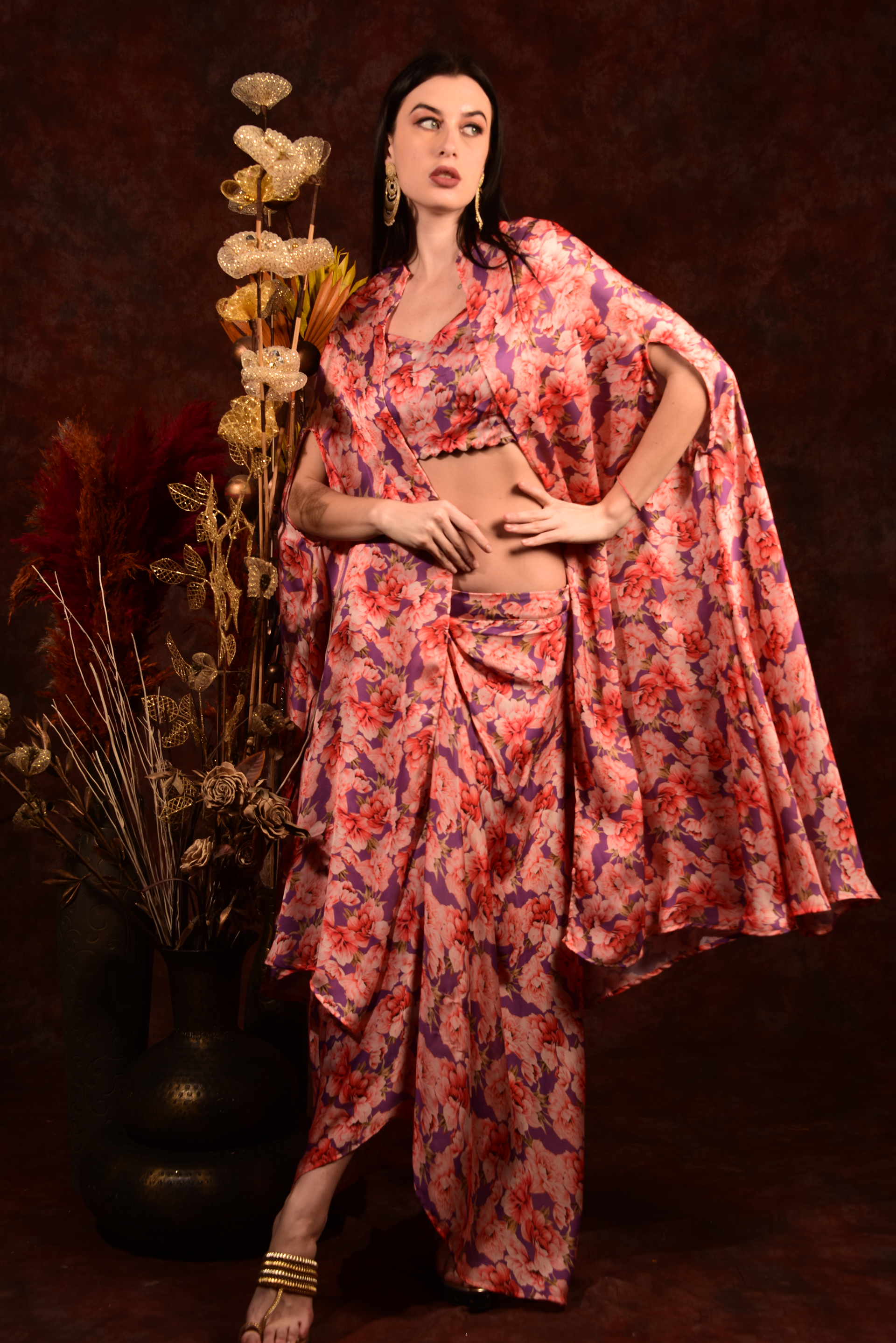 Get ready to turn heads with our Printed Crop top shrug and dhoti skirt set! The vibrant prints and comfortable fit make it perfect for any occasion. Add a touch of quirkiness to your wardrobe and make a statement. (This is the perfect outfit for those who like to stand out in style!)