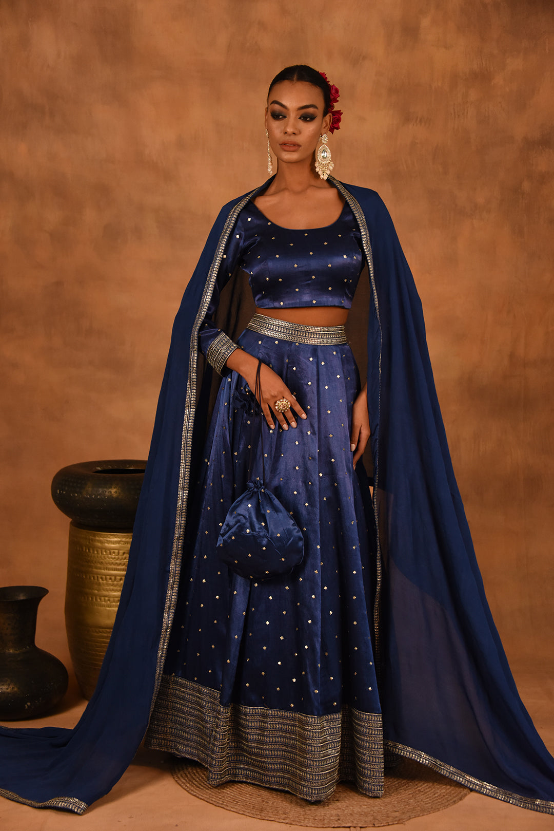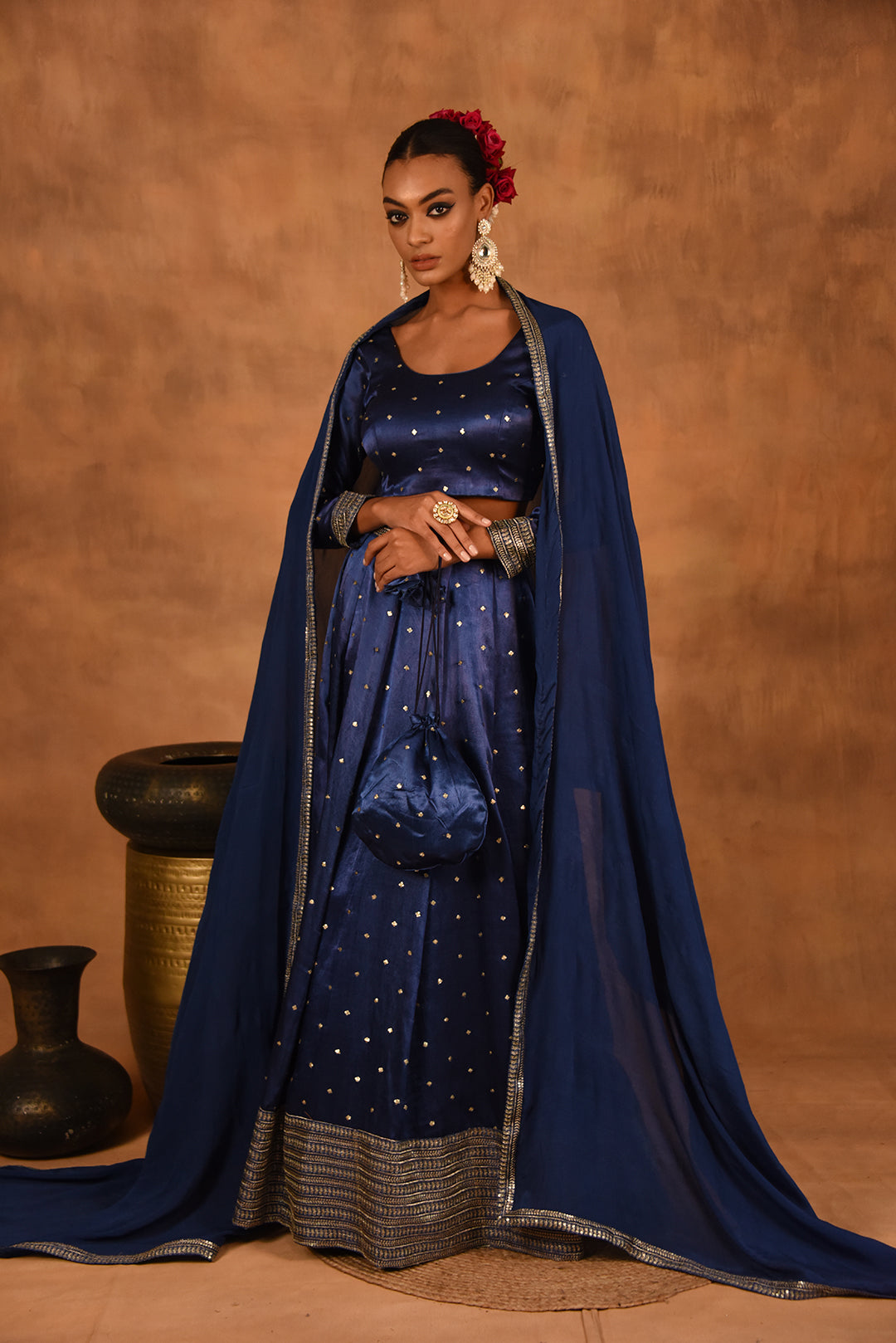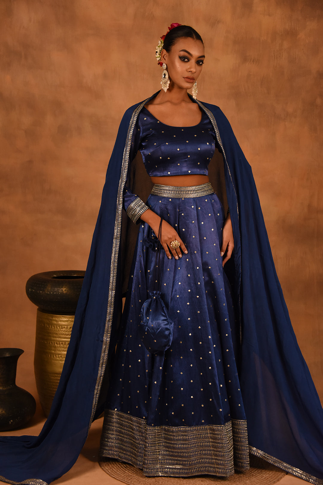 Expertly designed and crafted, this Royal Blue Gajji Silk Lehenga exudes elegance and grace. Made from high-quality Gajji silk, it offers a luxurious feel and a stunning appearance. Perfect for special occasions, this lehenga will make you stand out and feel confident.