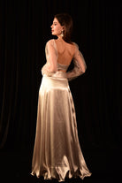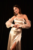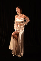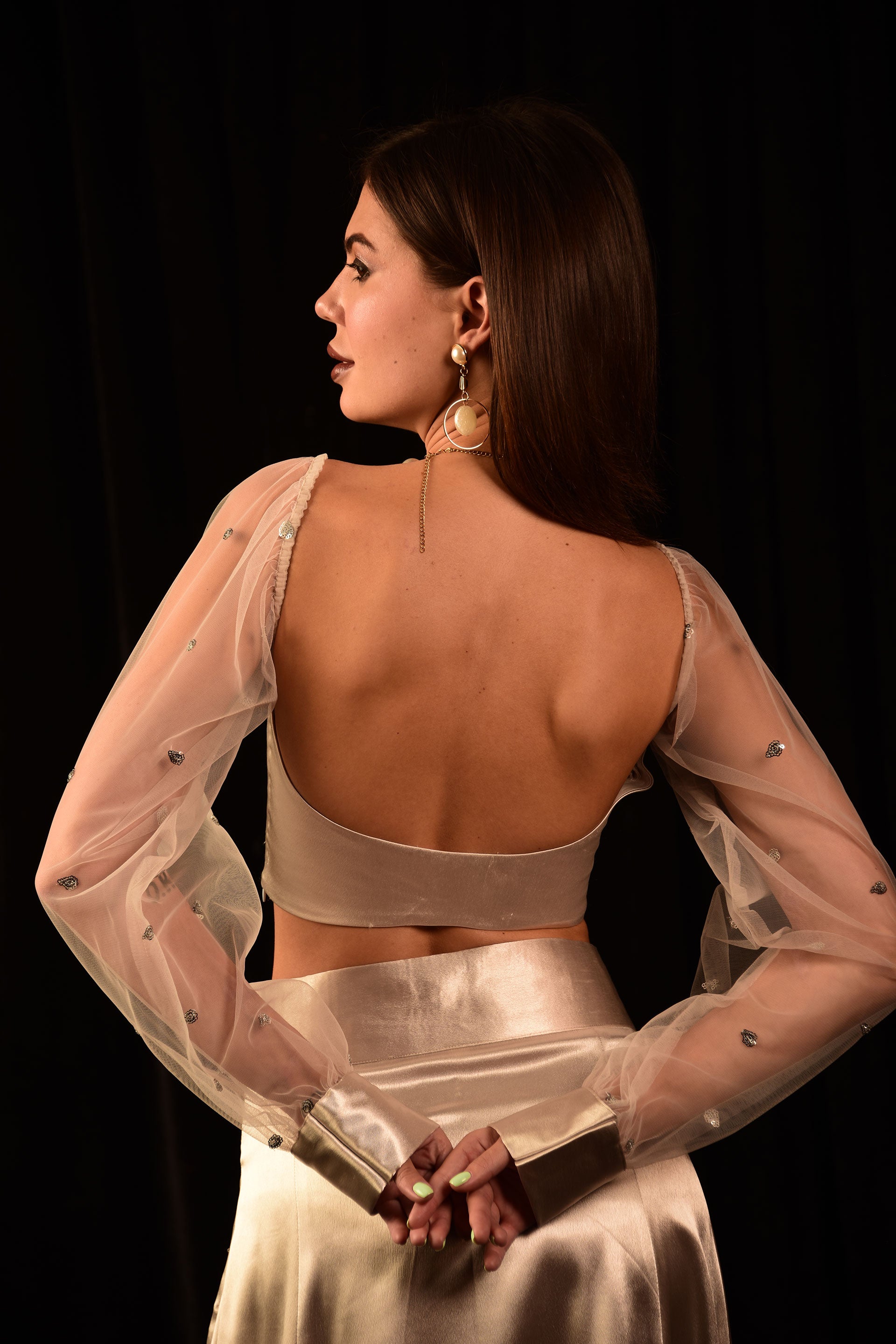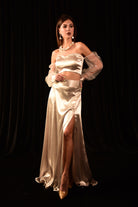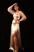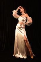 This elegant high slit crop top skirt is a stunning addition to any wardrobe. With its metallic silver hue and stylish design, it is perfect for a variety of occasions. The high slit adds a touch of drama while the crop top design enhances your figure. A must-have for any fashion-forward individual.