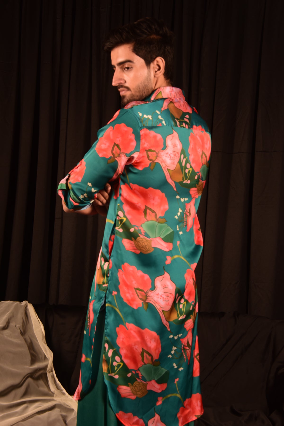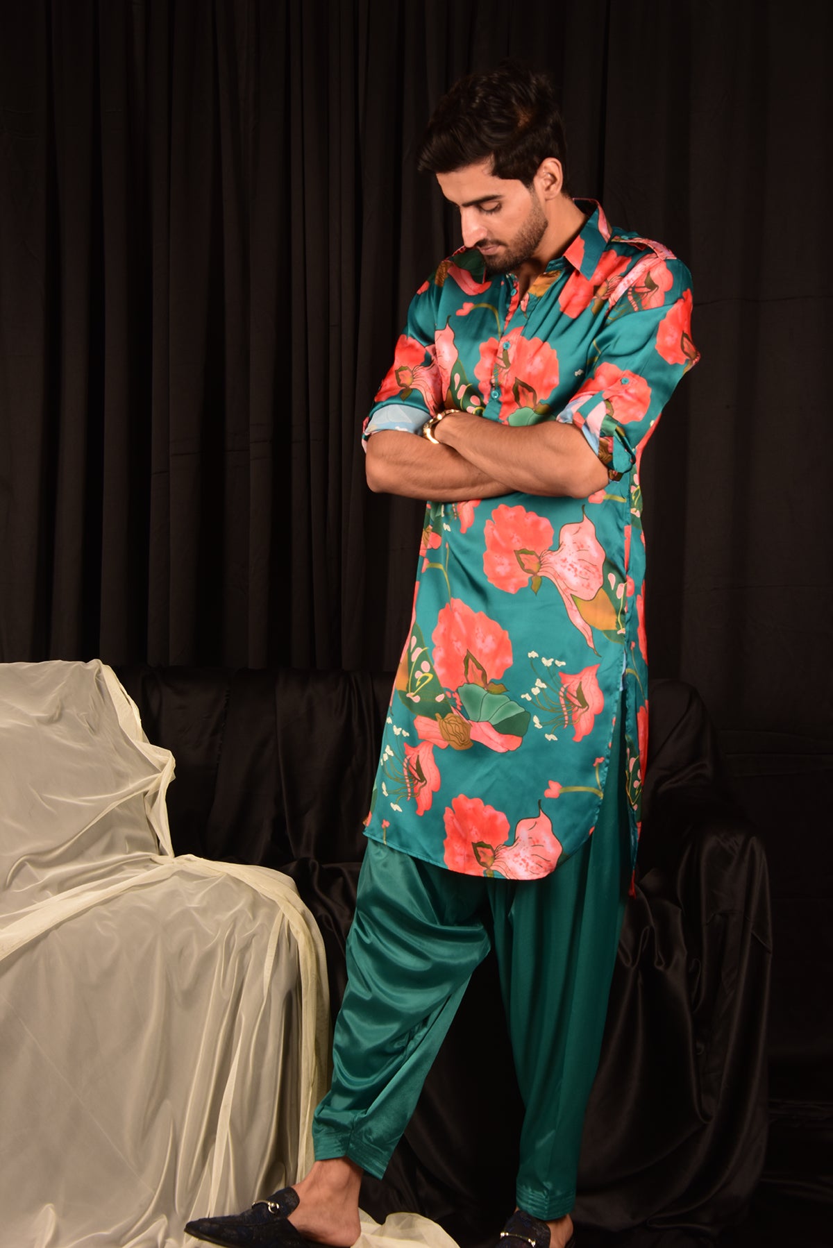 FOREST GREEN PRINTED PATHANI KURTA SET