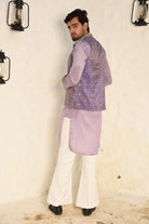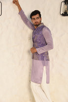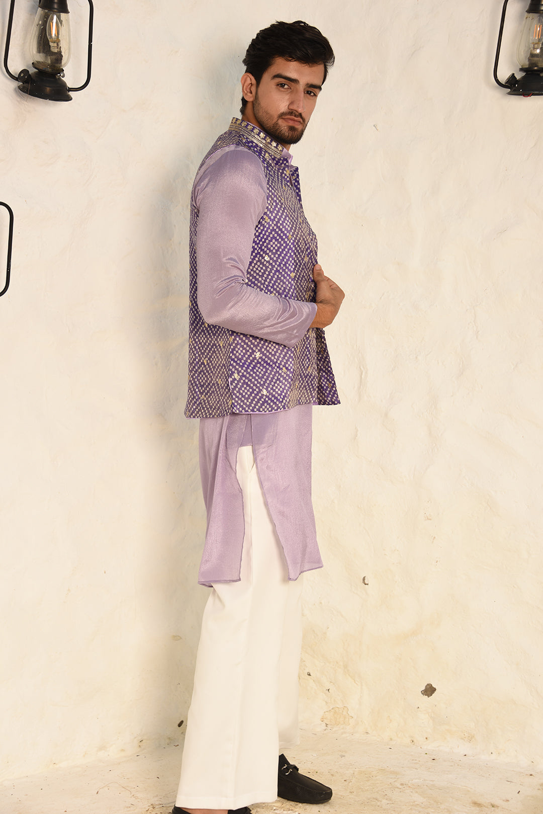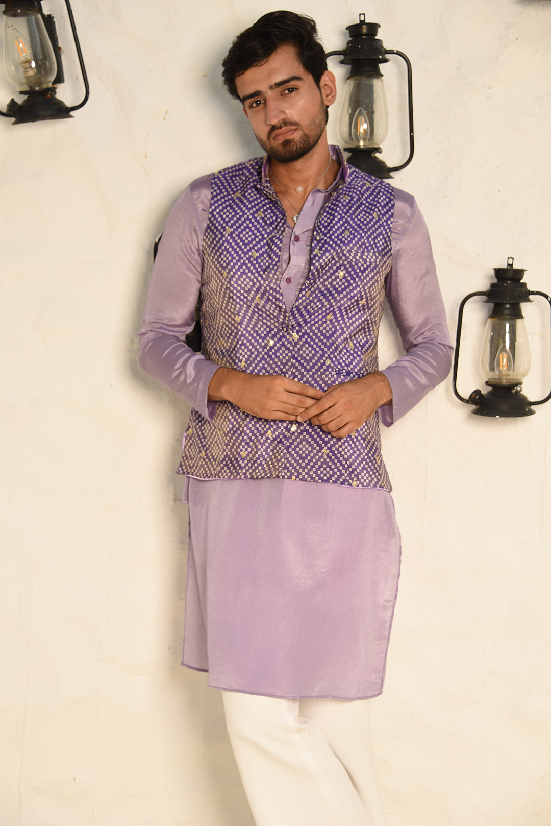 Unleash your inner fashionista with this playful LILAC CHINON STRAIGHT KURTA SET. Featuring a trendy BANDHI JACKET, this set will make you stand out from the crowd. Perfect for any occasion, this set offers both style and comfort.