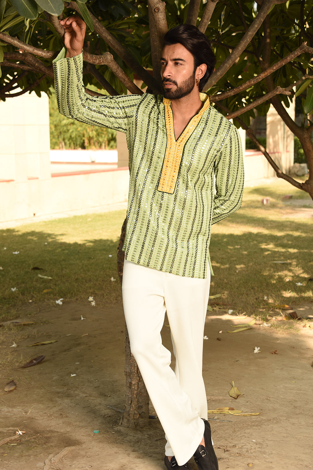 Add some playful flair to your wardrobe with this Mirror Embroidered Short Kurta with Pants. The mirror embroidery adds a touch of uniqueness to this short kurta, while the accompanying pants provide both comfort and style. Perfect for any fun and casual occasion.