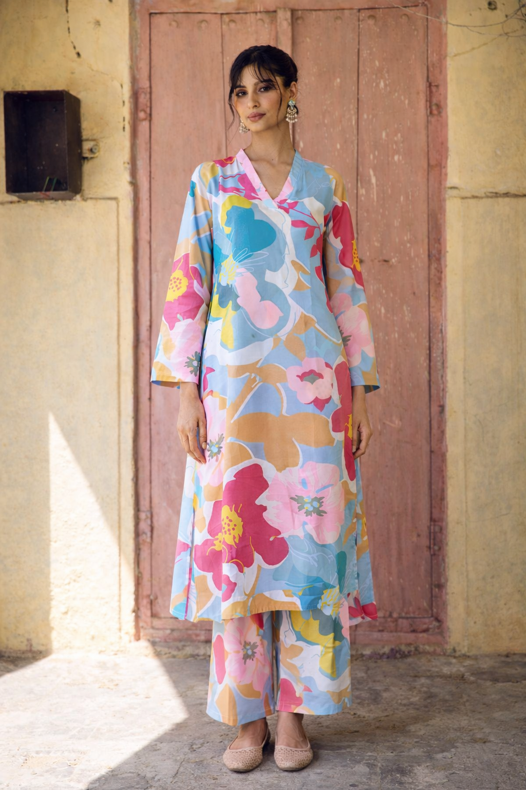 Pastel Abstract Printed V-Neck Kurta Set