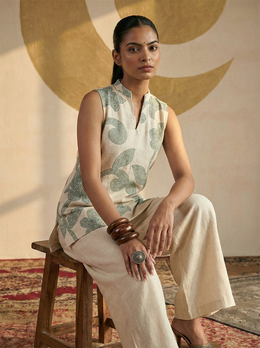 Soft Grey Botanical Print Sleeveless Kurta Set