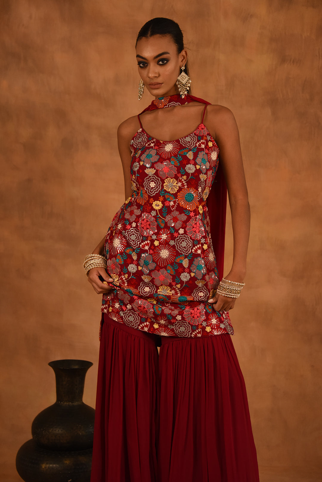 Upgrade your wardrobe with our elegant Red Floral Georgette Sharara Set. Made with high quality georgette fabric, this set features a stunning red floral design that is sure to make a statement. The flowy sharara pants add a touch of sophistication to this traditional outfit. Perfect for any special occasion.