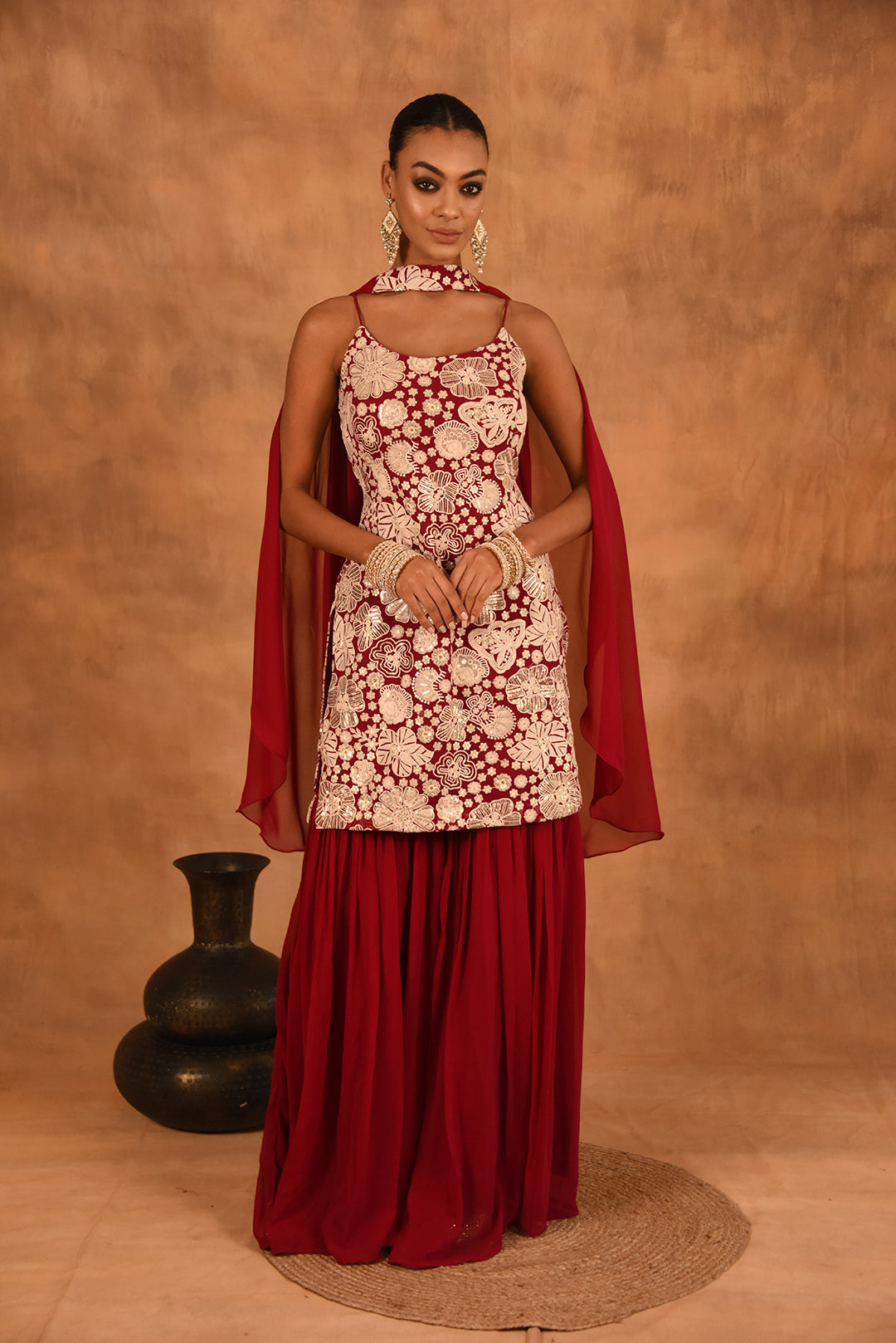 With its bold and vibrant TOMATO RED FLORAL print, this GEORGETTE SHARARA SET exudes effortless elegance and sophistication. Crafted with high-quality materials, this set offers a comfortable and flattering fit, perfect for any occasion. Embrace the beauty of floral patterns and elevate your style with this stunning outfit.