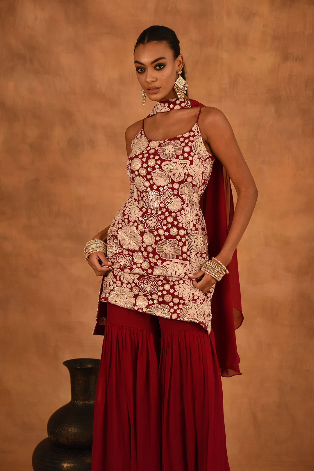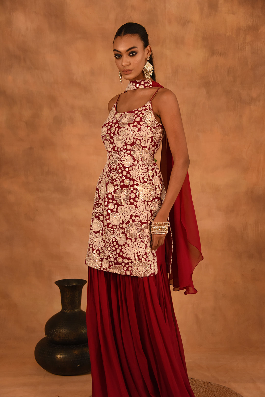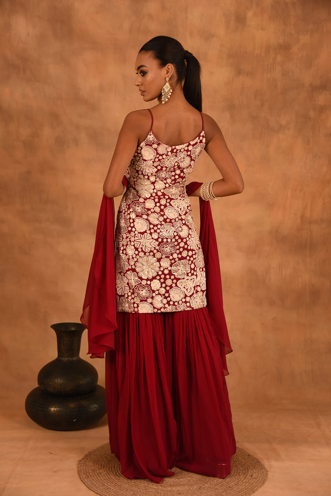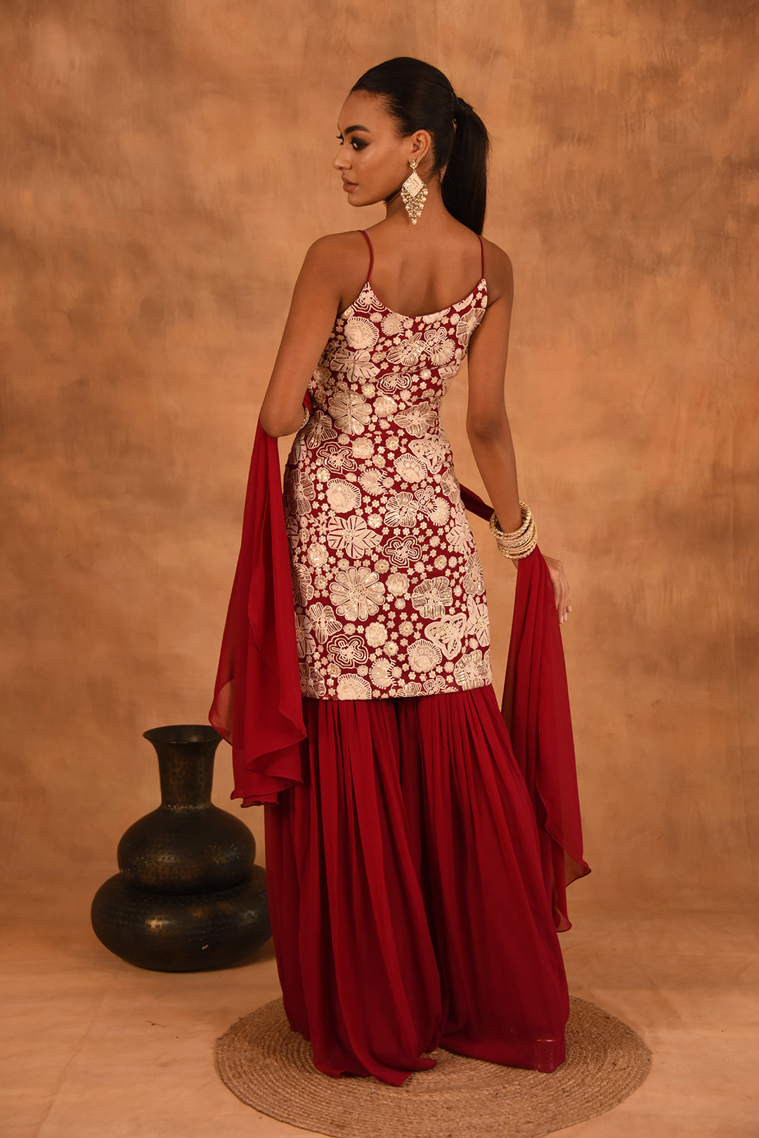 TOMATO RED FLORAL GEORGETTE SHARARA SET