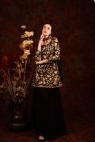 Dress to impress with our black golden peplum top and matching skirt dupatta! This stunning set features elegant floral design and a flattering peplum silhouette. Perfect for any special occasion, it will have you looking and feeling your best. (Slay the style game with our unique black and gold combo!)