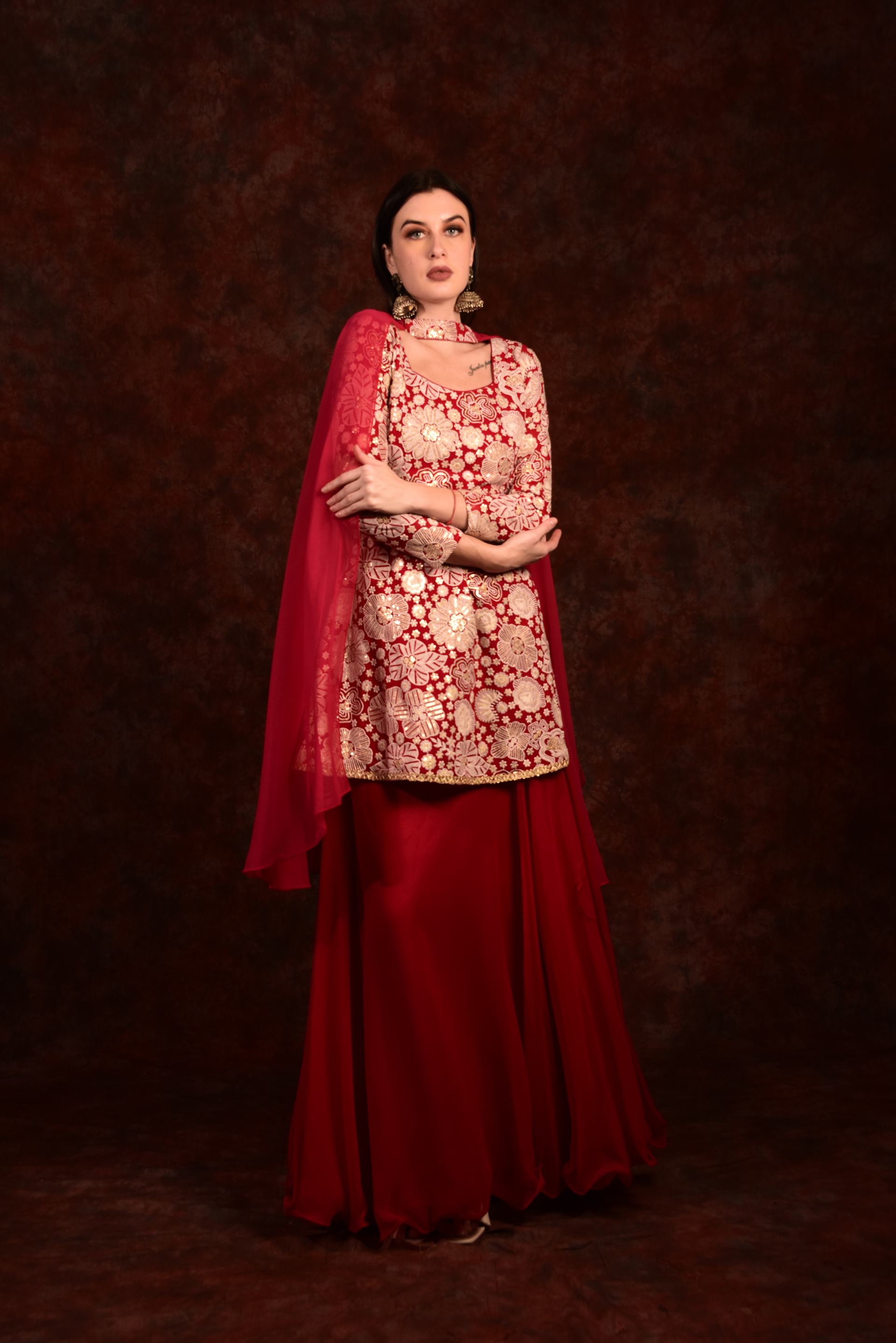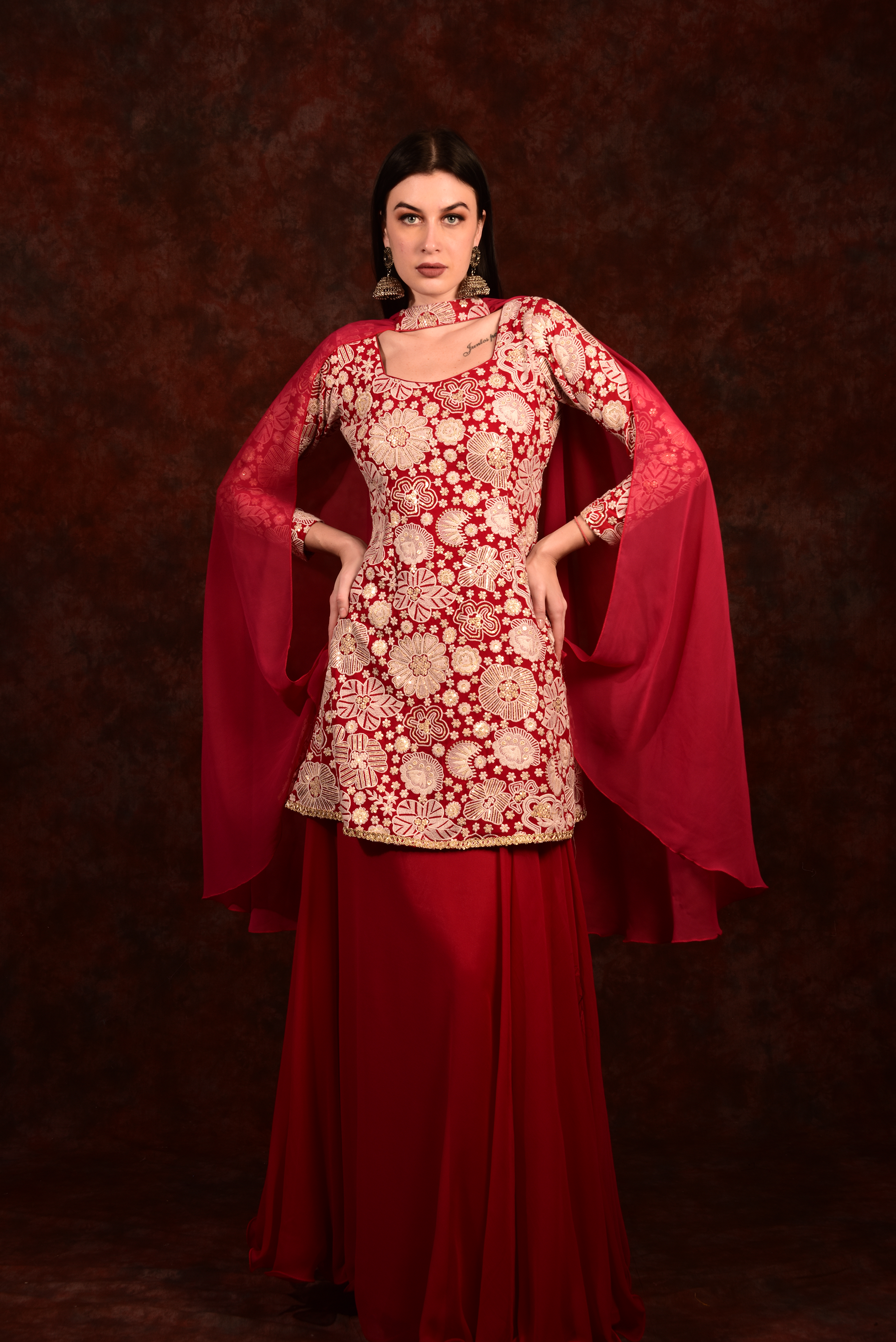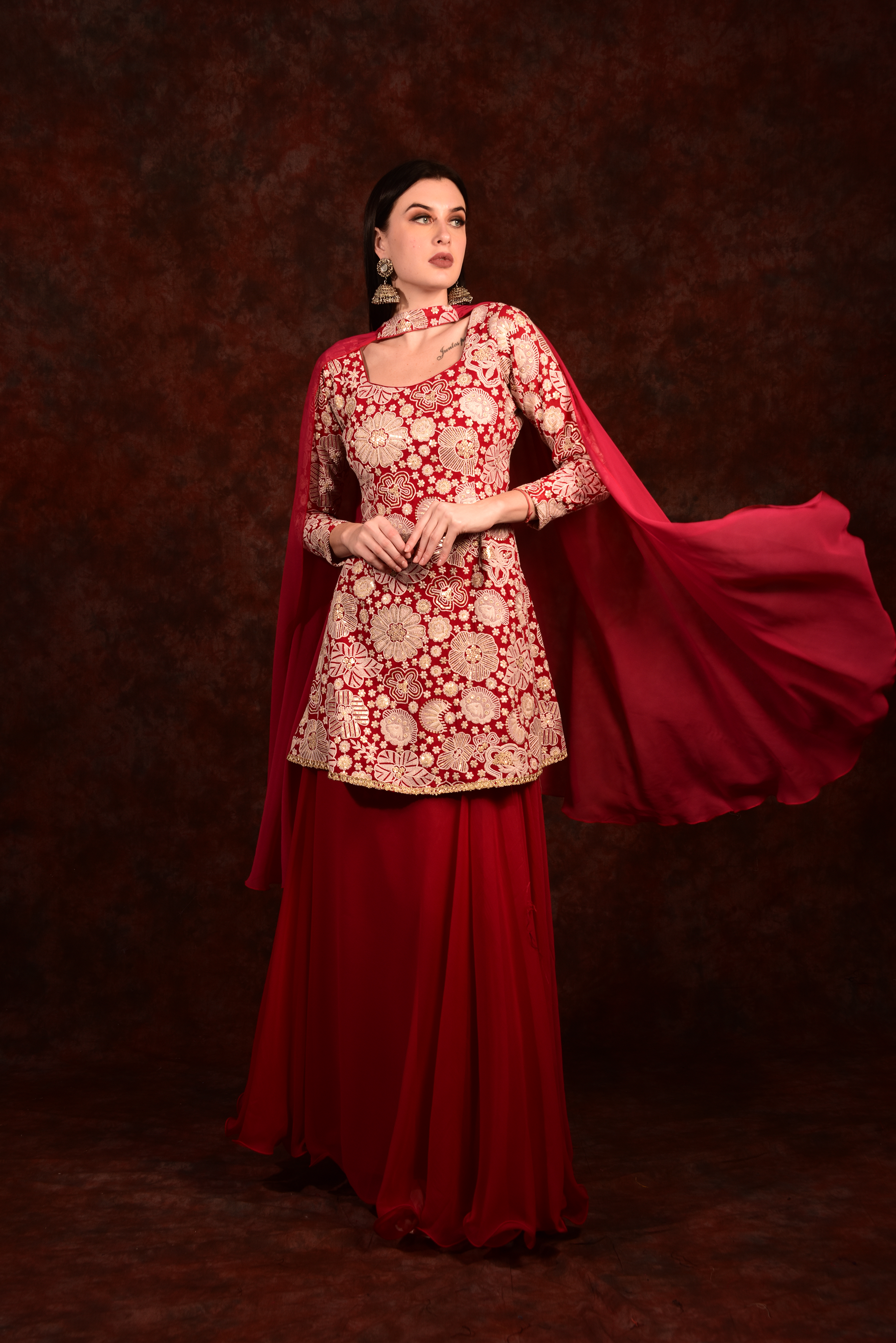 Red Peplum Top With Skirt And Dupatta