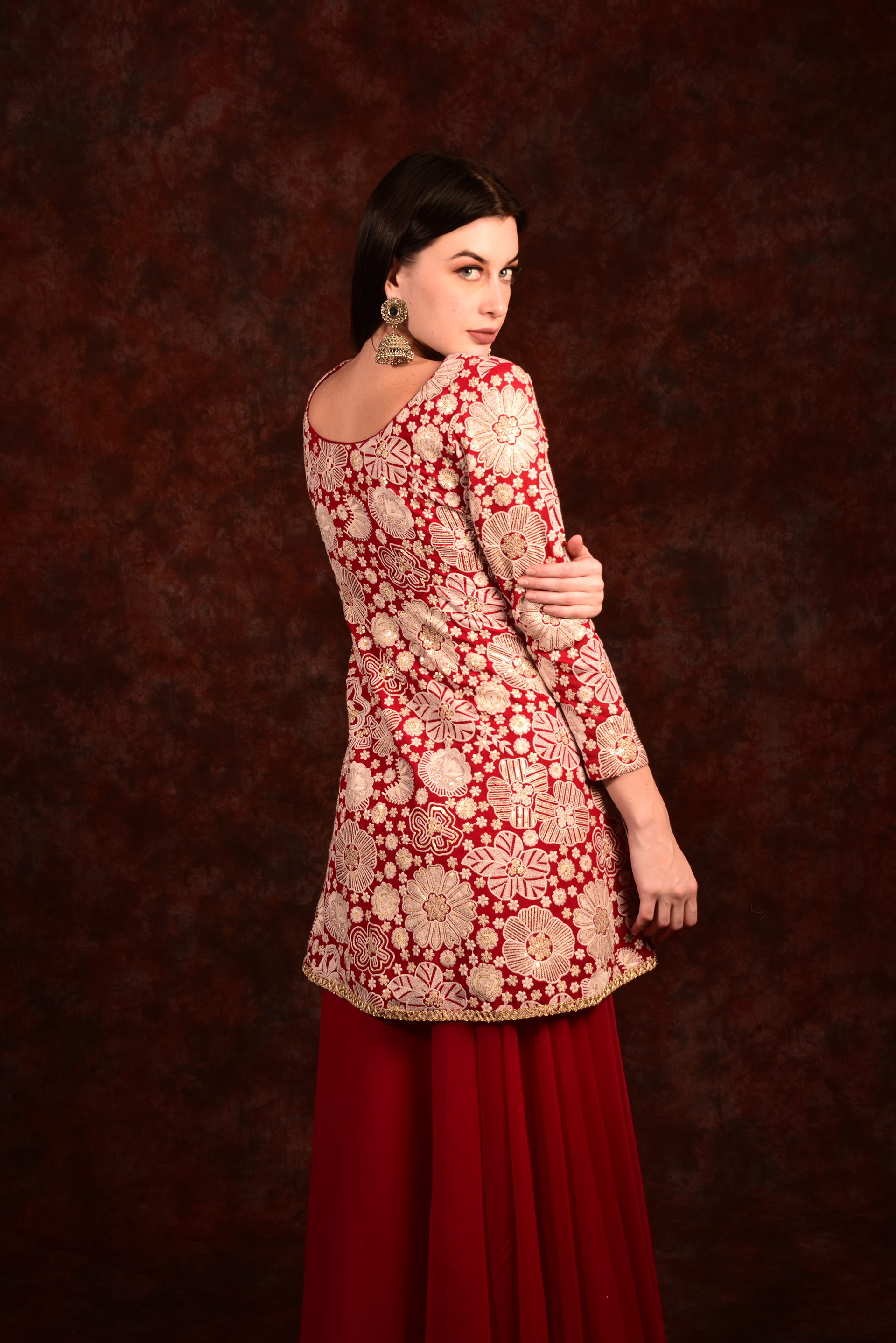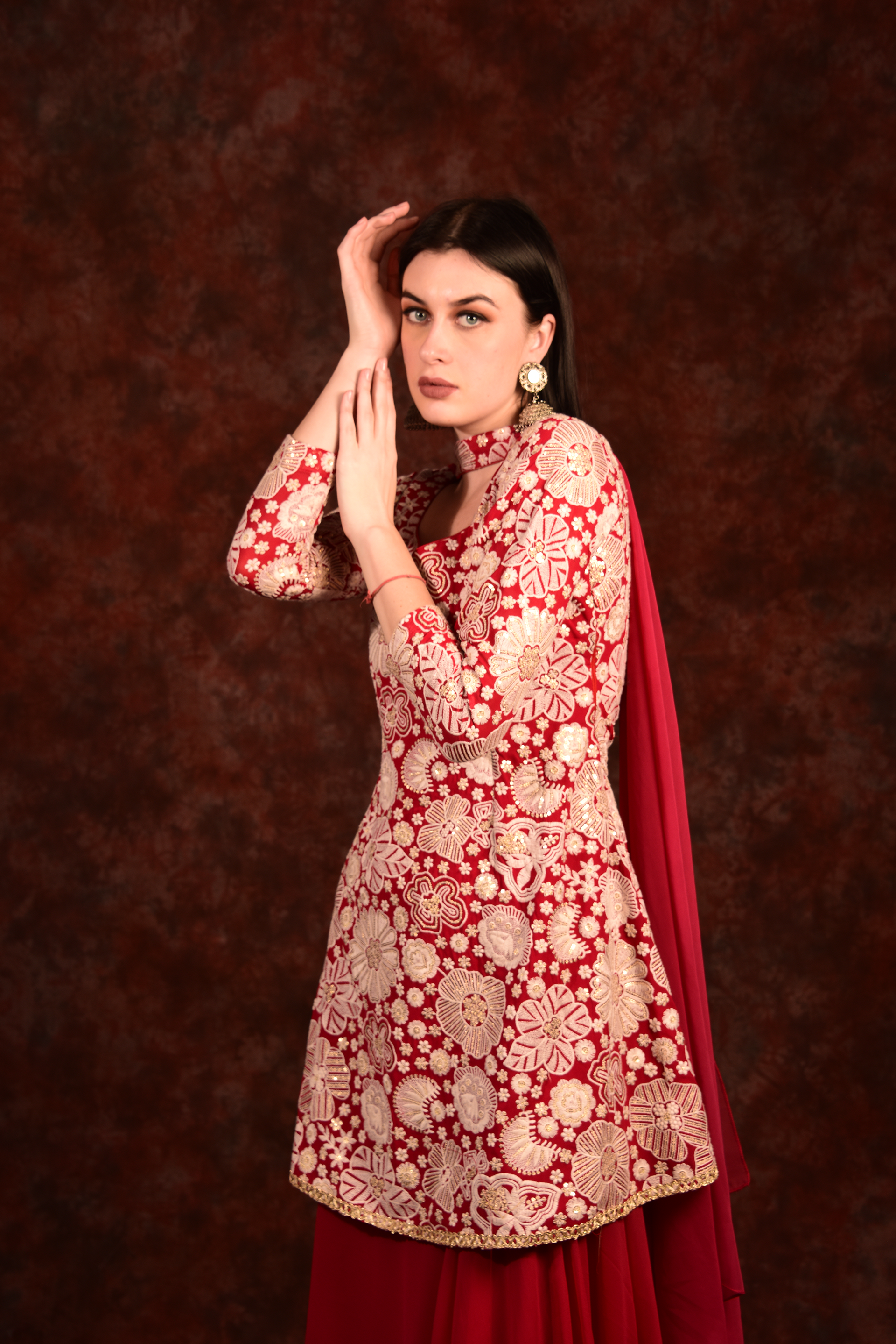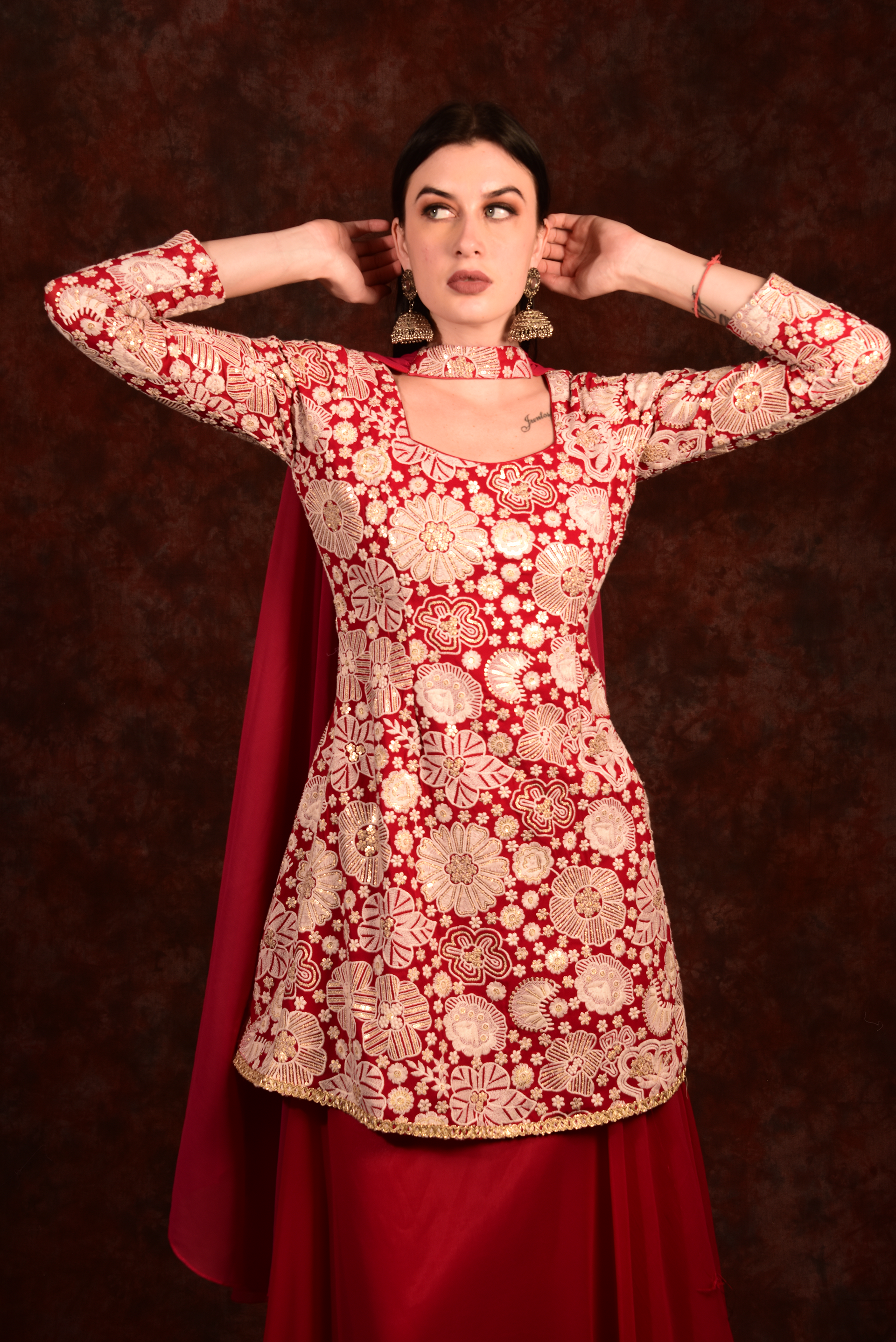 Red Peplum Top With Skirt And Dupatta